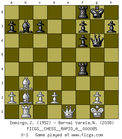 Last move : 0-1 2010 September 19 16:41:7 [Event "FICGS__CHESS__RAPID_A__000085"] [Site "FICGS"] [Date "2010.07.14"] [Round "1"] [White "Domingo,Jordi"] [Black "Bernal Varela,Nelson"] [Result "0-1"] [WhiteElo "1952"] [BlackElo "2038"] 1.b4 e5 2.Bb2 Bxb4 3.f4 d6 4.fxe5 dxe5 5.Nf3 Nc6 6.e3 Qe7 7.Bb5 Bd6 8.O-O Nf6 9.Nc3 e4 10.Nd4 O-O 11.Nxc6 bxc6 12.Bxc6 Rb8 13.Rb1 Bxh2+ 14.Kxh2 Ng4+ 15.Kg3 Qg5 16.Qe1 Nxe3 17.Kf2 Nxf1 18.Nxe4 Qg6 19.Nf6+ gxf6 20.Kxf1 Rb6 21.Ba4 Rb4 22.Bb3 Rf4+ 23.Kg1 Bb7 0-1 Polish (Sokolsky) opening Kingside Castling by player White (move 8) Kingside Castling by player Black (move 10) Player Black won this chess game. Follow this game move after move (download)There must have been a time when men were demigods, or they could not have invented Chess. (Gustav Schenk) Wer der Ansicht ist, daß alle Schachspieler verrückt sind, wird durch Studium des Lebens von Emil Josef Diemer nicht auf andere Gedanken kommen. (Hans Ree) Si yo gano un torneo, yo lo gano por mí mismo. Yo hago las jugadas. Nadie me ayuda. (Bobby Fischer) Que feriez-vous si vous étiez en train de jouer aux échecs et que la fin du monde arrive ? Je continuerais à jouer. (Saint Borromée) Do not put your faith in what statistics say until you have carefully considered what they do not say. (William W. Watt)