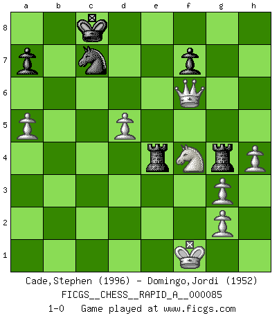 Last move : 1-0 2010 September 28 16:24:5 [Event "FICGS__CHESS__RAPID_A__000085"] [Site "FICGS"] [Date "2010.07.14"] [Round "1"] [White "Cade,Stephen"] [Black "Domingo,Jordi"] [Result "1-0"] [WhiteElo "1996"] [BlackElo "1952"] 1.d4 Nf6 2.c4 h6 3.Nc3 g5 4.h4 g4 5.e4 c5 6.dxc5 Qa5 7.Bd2 Qxc5 8.Nd5 Nxd5 9.cxd5 g3 10.fxg3 Na6 11.Rc1 Qb6 12.b4 Rg8 13.Qb3 d6 14.Be2 Bg4 15.Bxg4 Rxg4 16.Rc4 Bg7 17.Ne2 h5 18.Qa4+ Kd8 19.Rf1 Bf6 20.Qc2 Nc7 21.a4 Ne8 22.Rf3 Kd7 23.a5 Qb5 24.Rf5 b6 25.Rxh5 bxa5 26.bxa5 Rb8 27.Rb4 Qxb4 28.Bxb4 Rxb4 29.Qc6+ Kd8 30.Nf4 Rxe4+ 31.Kf2 Bd4+ 32.Kf1 Nc7 33.Rf5 Bf6 34.Rxf6 exf6 35.Qxd6+ Kc8 36.Qxf6 1-0 Queen's pawn game Player White won this chess game. Follow this game move after move (download)Help your pieces so they can help you. (Paul Morphy) Wenn du auf das Glück wartest, wird das Leben ziemlich langweilig. (Mikhail Nekhemyevich Tal) Alguna parte de un error es siempre correcto. (Savielly Tartakover) Aux échecs, les retours au sommet sont rares : les dommages psychologiques consécutifs à une défaite sont trop sévères. (Daily Telegraph) Winning isn't everything... but losing is nothing. (Mednis)