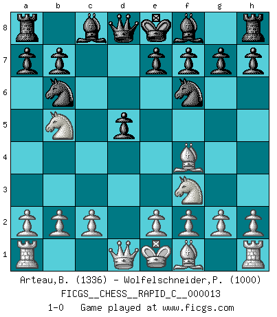Last move : 1-0 2006 November 25 17:43:55 [Event "FICGS__CHESS__RAPID_C__000013"] [Site "FICGS"] [Date "2006.11.14"] [Round "1"] [White "Arteau,Benoit"] [Black "Wolfelschneider,Peter"] [Result "1-0"] [WhiteElo "1336"] [BlackElo "1000"] 1.d4 d5 2.Nf3 Nf6 3.Bf4 c5 4.Nc3 cxd4 5.Nxd4 Nbd7 6.Nf3 Nb6 7.Nb5 1-0 Queen's Bishop game Player White won this chess game. Follow this game move after move (download)To avoid losing a piece, many a person has lost the game. (Savielly Tartakover) Schach ist das schnellste Spiel der Welt, weil man in jeder Sekunde Tausende von Gedanken ordnen muß. (Albert Einstein) En el Ajedrez, tal como en la vida, las bendiciones de hoy pueden ser el veneno del mañana. (Assaic) Des combinaisons [dans le jeu d'échecs] pareilles à des mélodies. Je crois entendre pour ainsi dire la musique des coups... (Vladimir Nabokov) Nobody is always a winner, and anybody who says he is, is either a liar or doesn't play poker. (Amarillo Slim)