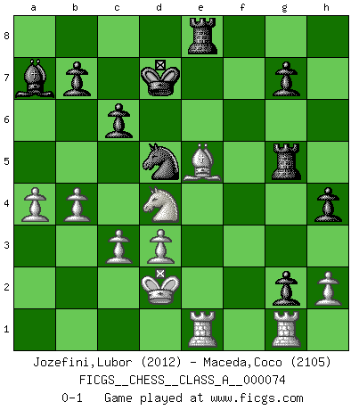 Last move : 0-1 2011 February 2 7:56:45 [Event "FICGS__CHESS__CLASS_A__000074"] [Site "FICGS"] [Date "2010.07.15"] [Round "1"] [White "Jozefini,Lubor"] [Black "Maceda,Coco"] [Result "0-1"] [WhiteElo "2012"] [BlackElo "2105"] 1.e4 e5 2.Nf3 Nc6 3.Bb5 f5 4.Nc3 fxe4 5.Nxe4 d5 6.Nxe5 dxe4 7.Nxc6 Qg5 8.Qe2 Nf6 9.Nxa7 Bd7 10.Bxd7+ Kxd7 11.f4 exf3 12.Qb5+ Qxb5 13.Nxb5 fxg2 14.Rg1 Re8+ 15.Kd1 Re5 16.a4 Rg5 17.d3 Rg6 18.Bf4 c6 19.Nd4 Bc5 20.c3 Nd5 21.Bg3 h5 22.Kd2 h4 23.Be5 Re8 24.b4 Ba7 25.Rae1 Rg5 0-1 Ruy Lopez : Schliemann defense, Berger variation Player Black won this chess game. Follow this game move after move (download)Excellence at Chess is one mark of a scheming mind. (Sir Arthur Conan Doyle) Bis jetzt ist Weiß einer wohlbekannten Analyse gefolgt. Aber jetzt begeht er einen schrecklichen Fehler: Er beginnt seinen eigenen Kopf zu benutzen. (Siegbert Tarrasch) Cuando tengo las piezas blancas, yo gano porque soy blanco; Cuando tengo las piezas negras, yo gano porque soy Bogolyubov. (Bogolyubov) Karpov est une pièce de musée. (Garry Kasparov) Bobby never cared about money, though. His only desire was to prove that his choices were correct: He wanted chess to be important because he was a chess player, and he wanted to be important. Bobby knew money was important, but he didn't have a clue why, outside of clothes and status. The only way he could accomplish what he wanted was to fight for a lot of money. Once he got it, he gave it away. He did not know how to spend it. And once he'd become champion, after, essentially, sacrificing his life for it, he didn't know how to spend his time. (Bob Wade)