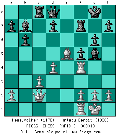 Last move : 0-1 2006 December 3 21:34:21 [Event "FICGS__CHESS__RAPID_C__000013"] [Site "FICGS"] [Date "2006.11.14"] [Round "1"] [White "Hess,Volker"] [Black "Arteau,Benoit"] [Result "0-1"] [WhiteElo "1178"] [BlackElo "1336"] 1.e4 c5 2.c3 Nf6 3.e5 Nd5 4.d4 cxd4 5.cxd4 Nc6 6.Nf3 e6 7.Nc3 Bb4 8.Bd2 Nxc3 9.bxc3 Be7 10.Bd3 f5 11.exf6 Bxf6 12.O-O O-O 13.Qc2 g6 14.Bh6 Rf7 15.Rae1 Ne7 16.Re4 Nf5 17.Bf4 b6 18.Be5 Bb7 19.Rf4 Rc8 20.Bxf5 exf5 21.Ng5 Bxg5 0-1 Sicilian : Alapin's variation (2.c3) Kingside Castling by player White (move 12) Kingside Castling by player Black (move 12) Player Black won this chess game. Follow this game move after move (download)Openings teach you openings. Endgames teach you chess ! (Stephan Gerzadowicz) Ein Teil des Fehlers ist immer korrekt. (Savielly Grigorievitsch Tartakower) El Ajedrez moderno está demasiado preocupado con cosas como la estructura de Peones. Olvidenlo, el Jaque Mate termina la partida. (Nigel Short) Si rien de grave n'est détecté lors de l'analyse d'une position, on joue alors le coup. Seconde règle de Blumenfeld. Luck has a peculiar habit of favoring those who don't depend on it. (Author unknown)
