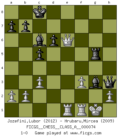 Last move : 1-0 2011 May 5 17:34:52 [Event "FICGS__CHESS__CLASS_A__000074"] [Site "FICGS"] [Date "2010.07.15"] [Round "1"] [White "Jozefini,Lubor"] [Black "Hrubaru,Mircea"] [Result "1-0"] [WhiteElo "2012"] [BlackElo "2009"] 1.e4 c5 2.c3 d6 3.d4 Nf6 4.d5 e6 5.Bb5+ Bd7 6.Bd3 exd5 7.exd5 Nxd5 8.Ne2 Nc6 9.O-O Be7 10.Bxh7 Rxh7 11.Qxd5 Ne5 12.Qe4 g6 13.Bf4 Bc6 14.Qe3 Nc4 15.Qc1 Qd7 16.f3 O-O-O 17.Nd2 Ne5 18.Ne4 f5 19.Ng5 Nd3 20.Qe3 Nxf4 21.Qxf4 Rh5 22.Nh3 g5 23.Qd2 Rh4 24.Nxg5 f4 25.Nh3 Rxh3 26.gxh3 Qxh3 27.Qxf4 Rg8+ 28.Ng3 Bh4 29.Qf7 Rg5 30.Rae1 Bxg3 31.Qe6+ 1-0 This chess game has been lost on time (started : 2010.07.15 5:43:51) Sicilian : Alapin's variation (2.c3) Kingside Castling by player White (move 9) Queenside Castling by player Black (move 16) Player White won this chess game. Follow this game move after move (download)It is no time to be playing Chess when the house is on fire. (Italian Proverb) Schach ist die gewalttätigste aller Sportarten. (Garry Kasparov) Debes de llevar a tu oponente hacia un profundo y obscuro bosque donde 2+2=5, y el camino que conduce a la salida es suficientemente ancho para solamente uno. (Mikhail Tal) Les Echecs représentent une sphère d'idées créatrices basée sur la volonté des deux protagonistes. (Smyslov) Luck is the residue of design. (John Milton)