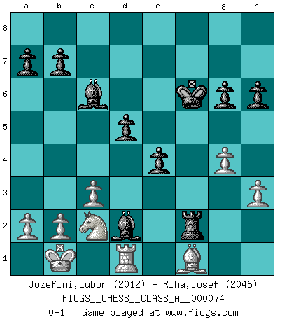 Last move : 0-1 2010 November 25 16:6:32 [Event "FICGS__CHESS__CLASS_A__000074"] [Site "FICGS"] [Date "2010.07.15"] [Round "1"] [White "Jozefini,Lubor"] [Black "Riha,Josef"] [Result "0-1"] [WhiteElo "2012"] [BlackElo "2046"] 1.e4 e6 2.d4 d5 3.e5 c5 4.c3 Nc6 5.f4 Nh6 6.Nf3 Qb6 7.dxc5 Bxc5 8.Bd3 Bd7 9.Qb3 O-O 10.Qxb6 Bxb6 11.Nbd2 Ng4 12.Rf1 f6 13.exf6 Rxf6 14.Ng5 h6 15.Ngf3 Rxf4 16.Nb3 Rxf3 17.Rxf3 Nce5 18.Bf4 Nxf3+ 19.gxf3 Rf8 20.fxg4 Rxf4 21.h3 Rf3 22.Bf1 Rf2 23.O-O-O e5 24.Bd3 Bc6 25.Bf5 Kf7 26.Na1 Be3+ 27.Kb1 g6 28.Bd3 e4 29.Bf1 Kf6 30.Nc2 Bd2 0-1 French : Advance variation Kingside Castling by player Black (move 9) Queenside Castling by player White (move 23) Player Black won this chess game. Follow this game move after move (download)The Pawns are the soul of the game. (Francois Andre Danican Philidor) Das Spiel gibt uns die Genugtuung, die das Leben uns versagt. (Emanuel Lasker) Repentinamente, me resultaba obvio en mi analisis que yo había pasado por alto lo que Fischer había visto en el tablero con la mas grande facilidad. (Mikhail Botvinnik) Psychologiquement, tu dois avoir confiance en toi même, mais cette confiance doit être basée sur des faits. (Robert Fischer) Kids, you tried your best and you failed miserably. The lesson is, never try. (Simpsons)