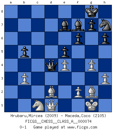 Last move : 0-1 2011 April 26 4:20:37 [Event "FICGS__CHESS__CLASS_A__000074"] [Site "FICGS"] [Date "2010.07.15"] [Round "1"] [White "Hrubaru,Mircea"] [Black "Maceda,Coco"] [Result "0-1"] [WhiteElo "2009"] [BlackElo "2105"] 1.d4 Nf6 2.c4 e6 3.Nf3 d5 4.g3 Be7 5.Bg2 O-O 6.O-O dxc4 7.Qc2 a6 8.a4 Nc6 9.Qxc4 Qd5 10.Nbd2 Rd8 11.e3 Qh5 12.e4 Bd7 13.b3 Rac8 14.h3 Be8 15.g4 Qa5 16.Bb2 Nb4 17.Qe2 c5 18.Nc4 Qc7 19.Rfd1 b5 20.axb5 axb5 21.Nce5 h6 22.dxc5 Bxc5 23.Ne1 Qb6 24.N1d3 Nxd3 25.Nxd3 Be7 26.Ne5 Nh7 27.Rxd8 Rxd8 28.Rd1 Rxd1+ 29.Qxd1 f6 30.Nd3 e5 31.Bc1 Qc7 32.Be3 Qc3 33.Nc1 Bf7 34.Bd2 Qd4 0-1 This chess game has been lost on time (started : 2010.07.15 5:43:51) Queen's pawn game Kingside Castling by player Black (move 5) Kingside Castling by player White (move 6) Player Black won this chess game. Follow this game move after move (download)After black's reply to 1.e4 with 1..e5, leaves him always trying to get into the game. (Howard Staunton) Habe Mut, dich deines eigenen Verstandes zu bedienen. (Immanuel Kant) Los Peones son nacidos libres, y aún así, se encuentran encadenados por todos lados. (Rick Kennedy) A chaque perte on perd un peu de soi. (Joël Lautier) Computer Science is no more about computers than astronomy is about telescopes. (Edsger W. Dijkstra)
