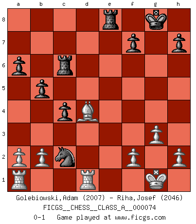 Last move : 0-1 2010 November 16 22:13:4 [Event "FICGS__CHESS__CLASS_A__000074"] [Site "FICGS"] [Date "2010.07.15"] [Round "1"] [White "Golebiowski,Adam"] [Black "Riha,Josef"] [Result "0-1"] [WhiteElo "2007"] [BlackElo "2046"] 1.d4 Nf6 2.Nf3 d5 3.c4 e6 4.g3 dxc4 5.Bg2 a6 6.O-O Nc6 7.Nc3 Rb8 8.e4 Be7 9.Qe2 b5 10.Rd1 O-O 11.d5 exd5 12.e5 d4 13.exf6 Bxf6 14.Qe4 Bb7 15.Nd5 Nb4 16.Nxf6+ Qxf6 17.Qf4 c5 18.Qxf6 gxf6 19.Bf4 Rbd8 20.Bc7 Rc8 21.Bd6 Rfd8 22.Be7 Re8 23.Bxf6 Nd3 24.Rd2 Bc6 25.Nxd4 cxd4 26.Bxc6 Rxc6 27.Bxd4 Ne1 28.R2d1 Nc2 0-1 This chess game has been lost on time (started : 2010.07.15 5:43:51) Queen's pawn game Kingside Castling by player White (move 6) Kingside Castling by player Black (move 10) Player Black won this chess game. Follow this game move after move (download)I guess a certain amount of temperament is expected of Chess geniuses. (Ron Gross) Ich las kürzlich ein Buch von Nietzsche. Er sagte Religion verdumme nur die Menschen. Ich stimme zu. (Robert James Fischer) Cuando tu no sabes absolutamente que mas hacer, es tiempo de entrar en pánico. (John van der Wiel) J'apprécie les joueurs d'est-indienne, c'est grâce à eux que je nourris ma famille depuis tant d'années. (Petrosian) Men never do evil so completely and cheerfully as when they do it from religious conviction. (Blaise Pascal)
