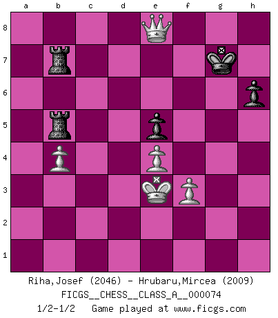 Last move : 1/2-1/2 2010 August 22 13:51:11 [Event "FICGS__CHESS__CLASS_A__000074"] [Site "FICGS"] [Date "2010.07.15"] [Round "1"] [White "Riha,Josef"] [Black "Hrubaru,Mircea"] [Result "1/2-1/2"] [WhiteElo "2046"] [BlackElo "2009"] 1.e4 c5 2.Nf3 Nc6 3.d4 cxd4 4.Nxd4 Nf6 5.Nc3 e5 6.Ndb5 d6 7.Bg5 a6 8.Na3 b5 9.Nd5 Be7 10.Bxf6 Bxf6 11.c3 Bg5 12.Nc2 Rb8 13.a4 bxa4 14.Ncb4 Bd7 15.Bxa6 Nxb4 16.cxb4 O-O 17.O-O Bc6 18.Rxa4 Bxa4 19.Qxa4 g6 20.Qc6 Bd2 21.b5 Ba5 22.Bb7 f6 23.b4 Bb6 24.Nxb6 Rf7 25.Rd1 Rfxb7 26.Rxd6 Qxd6 27.Qxd6 Rxb6 28.Qd5+ Kf8 29.g4 g5 30.h4 gxh4 31.Qd2 Kg7 32.Qd7+ Kg6 33.Qf5+ Kg7 34.Kh2 Rxb5 35.g5 fxg5 36.Qxg5+ Kf8 37.Kh3 Kf7 38.Qf5+ Kg8 39.Kxh4 Kg7 40.Qd7+ Kg6 41.Qe6+ Kg7 42.Qe7+ Kg8 43.f3 h6 44.Kg3 R8b6 45.Kf2 Rb7 46.Qe8+ Kg7 47.Ke3 1/2-1/2 Sicilian : Pelikan (Lasker/Sveshnikov) variation Kingside Castling by player Black (move 16) Kingside Castling by player White (move 17) 10 pieces endgame at move 39 : White KQPPP , Black KRRPP WHITE : King + 1 Queen 3 Pawns BLACK : King + 2 Rooks 2 Pawns This chess game ended in a draw. Follow this game move after move (download)After a bad opening, there is hope for the middle game. After a bad middle game, there is hope for the endgame. But once you are in the endgame, the moment of truth has arrived. (Edmar Mednis) Schach wird sich dank seiner hohen kulturellen Tradition immer durchsetzen. In näherer Zukunft womöglich sogar als Gegenreaktion auf die maßlose Reizüberflutung im Freizeit- und Spielbereich. (Garry Kasparov) Solo puedes ser bueno en el Ajedrez si amas al juego. (Bobby Fischer) La conception d'un plan est le processus par lequel un joueur exploite les avantages de sa position tout en s'efforçant d'en réduire au minimum les inconvénients. Afin de garantir le succès, un plan doit toujours se fonder sur un diagnostic objectif des particularités d'une position. La conception d'un plan est d'autant plus difficile que la position est équilibrée, et grandement facilitée lorsqu'il n'existe qu'un seul plan susceptible de répondre aux exigences de la position. (Harry Golombek) The real danger is not that computers will begin to think like men, but that men will begin to think like computers. (Sydney J. Harris)
