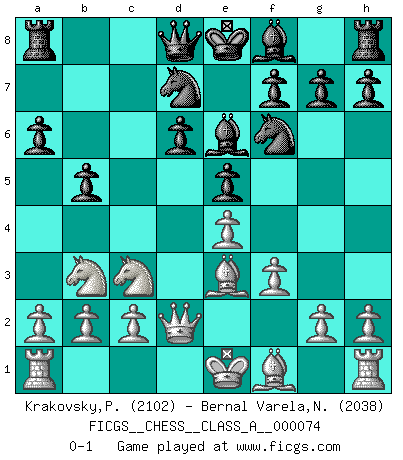 Last move : 0-1 2010 August 29 22:51:42 [Event "FICGS__CHESS__CLASS_A__000074"] [Site "FICGS"] [Date "2010.07.15"] [Round "1"] [White "Krakovsky,Peter"] [Black "Bernal Varela,Nelson"] [Result "0-1"] [WhiteElo "2102"] [BlackElo "2038"] 1.e4 c5 2.Nf3 d6 3.d4 cxd4 4.Nxd4 Nf6 5.Nc3 a6 6.Be3 e5 7.Nb3 Be6 8.f3 Nbd7 9.Qd2 b5 0-1 This chess game has been lost on time (started : 2010.07.15 5:43:51) Sicilian : Najdorf, Byrne (English) attack Player Black won this chess game. Follow this game move after move (download)In the perfect Chess combination as in a first-rate short story, the whole plot and counter-plot should lead up to a striking finale, the interest not being allayed until the very last moment. (Yates and Winter) Ich bewundere Kasparows phantasievolle Angriffssiege aus den Achtzigern und Neunzigern, aber wenn man sie mit dem Computer überprüft, nimmt der Computer in jeder zweiten Partie die Opfer an, verteidigt sich und gewinnt. (Vladimir Kramnik) El Rey es una pieza de pelea. ¡Usenlo!. (Wilhelm Steinitz) Un journaliste : 'Vous préférez avoir une dame de plus sur l'échiquier ou au lit ?' Boris Spassky : 'Ca dépend de la position.' Panic is a sudden desertion of us, an a going over to the enemy of our imagination. (Christian Nevell Bovee)