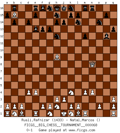 Last move : 0-1 2010 September 12 14:9:37 [Event "FICGS__BIG_CHESS__TOURNAMENT__000068"] [Site "FICGS"] [Date "2010.07.15"] [Round "1"] [White "Rusli,Rafnizar"] [Black "Natal,Marcos"] [Result "0-1"] [WhiteElo "1433"] [BlackElo ""] 1.j2-k4 b16-c14 2.h1-o7 c14-e13 3.o7-o15 p16-o14 4.o15-f7 f15-f14 5.m2-m4 d15-d14 6.d2-d4 m15-m13 7.e2-e4 n15-n13 8.n2-n4 m13-m12 9.p1-q3 c16-q3 10.p2-q3 q15-q13 11.f7-c7 o16-m14 12.c7-c15 b15-b14 13.o1-a14 e13-g14 14.a14-b15 a16-b16 15.f1-c4 m14-h10 16.c4-h9 g14-h12 17.c15-c11 h10-e13 18.c11-c10 g15-g13 19.c10-d11 f14-f13 20.d11-p11 l16-p12 21.p11-n13 j15-l14 22.n13-n8 q16-n16 0-1 Follow this game move after move (download)Chess is a forcing house where the fruits of character can ripen more fully than in life. (Edward Morgan Foster) Über Karpov: Er war und ist ein Vertreter der russischen Reaktionäre. Das steckt tief in seiner Seele, wehalb ich nicht nett mit ihm umgehen kann. (Viktor Kortschnoi) Hoy en día, si tu no eres un Gran Maestro a los 14 años, es mejor que lo olvides. (Anand Viswanathan) La vie et les Echecs sont tous les deux une lutte constante. (Lasker) I'm extremely disappointed. I send you out for exciting, new designer drugs, you come back with tomato sauce. (Gregory House, House M.D.)