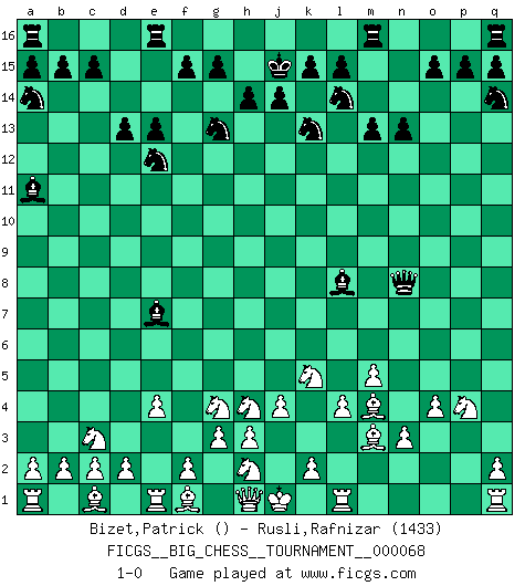 Last move : 1-0 2010 October 12 21:47:5 [Event "FICGS__BIG_CHESS__TOURNAMENT__000068"] [Site "FICGS"] [Date "2010.07.16"] [Round "1"] [White "Bizet,Patrick"] [Black "Rusli,Rafnizar"] [Result "1-0"] [WhiteElo ""] [BlackElo "1433"] 1.j3-j4 j15-k13 2.g2-g3 h16-o10 3.m2-m4 e15-e13 4.h2-g4 n15-n13 5.e2-e4 m15-m13 6.b1-c3 d15-d13 7.o2-o4 o16-h10 8.n2-n3 c16-n6 9.l2-l4 b16-a14 10.m4-m5 n6-l8 11.k1-j3 k16-l14 12.p1-o3 o10-q8 13.l1-m2 f16-a11 14.m2-l3 q8-n8 15.l3-m4 p16-q14 16.o1-m3 g16-f14 17.p2-p3 l8-p4 18.m1-o1 l16-p12 19.o3-n5 p4-q3 20.o1-l1 h10-e7 21.j2-h4 h15-g13 22.g1-f3 j16-j15 23.j3-k5 f14-e12 24.p3-p4 p12-l8 25.f3-h2 q3-p4 26.n5-p4 1-0 This big chess game has been lost on time (started : 2010.07.16 13:4:57) Follow this game move after move (download)Chess is not like life... it has rules ! (Mark Pasternak) Capablanka war das größte Genie der Schachgeschichte! Aber denken sie nicht er habe nichts vom Schach verstanden. Er wusste nur soviel wie er wissen musste um seine Ziele zu erreichen. (Mikhail Moiseyevich Botvinik) En el Ajedrez, cuando menos, el valiente hereda la tierra. (Edmar Mednis) Psychologiquement, tu dois avoir confiance en toi même, mais cette confiance doit être basée sur des faits. (Robert Fischer) I don't know, I don't care, and it doesn't make any difference. (Albert Einstein)