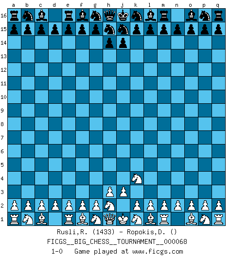 Last move : 1-0 2010 August 6 22:12:54 [Event "FICGS__BIG_CHESS__TOURNAMENT__000068"] [Site "FICGS"] [Date "2010.07.15"] [Round "1"] [White "Rusli,Rafnizar"] [Black "Ropokis,Dimitrios"] [Result "1-0"] [WhiteElo "1433"] [BlackElo ""] 1.j2-k4 1-0 Follow this game move after move (download)Could we look into the head of a Chess player, we should see there a whole world of feelings, images, ideas, emotion and passion. (Alfred Binet) Die größte Kunst beim Schach besteht darin dem Gegner nicht zu zeigen was er tun kann. (Garry Kasparov) La maestría del Ajedrez consiste esencialmente en analizar posiciónes de Ajedrez con precisión. (Mikhail Botvinnik) Si rien de grave n'est détecté lors de l'analyse d'une position, on joue alors le coup. Seconde règle de Blumenfeld. Somewhere in the world there is an epigram for every dilemma. (Hendrik Willem van Loon)