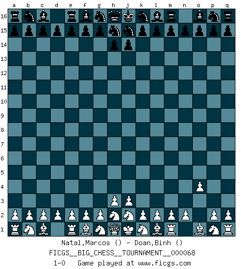 Last move : 1-0 2010 July 18 2:35:19 [Event "FICGS__BIG_CHESS__TOURNAMENT__000068"] [Site "FICGS"] [Date "2010.07.15"] [Round "1"] [White "Natal,Marcos"] [Black "Doan,Binh"] [Result "1-0"] [WhiteElo ""] [BlackElo ""] 1.o2-o4 1-0 Follow this game move after move (download)Chess is the art which expresses the science of logic. (Mikhail Botvinnik) Ich war schon mal beim Dopingtest. Da musste ich Urin abgeben, während Dritte zusahen. (Elisabeth Pähtz) El Ajedrez es una guerra en un tablero. El objetivo es aplastar la mente del oponente. (Bobby Fischer) Nous sommes les pions de la mystérieuse partie d'Echecs jouée par Dieu. Il nous déplace, nous arrête, nous pousse encore, puis nous lance un à un dans la boîte du Néant. Epitaphe sur la tombe de David Janowsky (1868-1927). Hello Thibault, if I have had a plan (and I had one, I hope), I have forgotten it during the last week... - Hello Heinz-Georg. What do you mean a plan ? (Anonymous players, during a Big Chess game)
