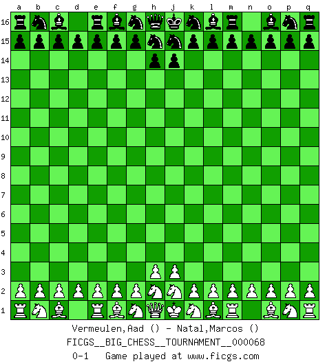 Last move : 0-1 2010 August 14 22:39:17 [Event "FICGS__BIG_CHESS__TOURNAMENT__000068"] [Site "FICGS"] [Date "2010.07.15"] [Round "1"] [White "Vermeulen,Aad"] [Black "Natal,Marcos"] [Result "0-1"] [WhiteElo ""] [BlackElo ""] 0-1 This big chess game has been lost on time (started : 2010.07.15 21:15:21) Follow this game move after move (download)If I win a tournament, I win it by myself. I do the playing. Nobody helps me. (Bobby Fischer) Wie ich sie so einen nach dem anderen nieder mähte wurde meine Überlegenheit offensichtlich. (José Raúl Capablanca) Algunos sacrificios son sólidos, los demás son míos. (Mikhail Tal) Il vaut mieux sacrifier les pièces de l'adversaire. (Xavier Tartacover) He who laughs last probably does not get the joke. (Unknown)