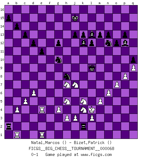 Last move : 0-1 2011 March 1 23:17:43 [Event "FICGS__BIG_CHESS__TOURNAMENT__000068"] [Site "FICGS"] [Date "2010.07.16"] [Round "1"] [White "Natal,Marcos"] [Black "Bizet,Patrick"] [Result "0-1"] [WhiteElo ""] [BlackElo ""] 1.n2-n4 h14-h13 2.m2-m4 g15-g13 3.l1-n3 f16-k12 4.d2-d4 p16-o14 5.e2-e4 j14-j13 6.o1-d11 e15-e13 7.f1-a6 e13-e12 8.d11-a8 f15-f13 9.a2-a3 d15-d13 10.a8-b7 k15-k13 11.m4-m5 l15-l13 12.c1-j7 b15-b14 13.p1-n2 c16-a14 14.n2-l3 m15-m13 15.b1-d2 g16-f14 16.d2-f3 l16-p12 17.q2-q4 c15-c13 18.q4-q5 b16-d15 19.q5-q6 f14-g12 20.p2-p4 d15-e13 21.p4-p5 k16-l14 22.o2-o4 n15-n13 23.q6-q7 q15-q13 24.o4-o5 f13-f12 25.p5-p6 o14-n12 26.c2-c4 h16-f14 27.b2-b4 l13-l12 28.c4-c5 o16-l13 29.q7-q8 o15-o13 30.n4-n5 f12-f11 31.n5-n6 g12-j11 32.o5-o6 e13-g12 33.o6-o7 q13-q12 34.n3-m4 q12-q11 35.p6-p7 o13-o12 36.p7-p8 q11-q10 37.q8-q9 j11-g10 38.d4-d5 j15-g14 39.d5-d6 g14-h12 40.e4-e5 h15-k14 41.e5-e6 k14-j12 42.e6-e7 l14-m12 43.g2-g4 j12-h10 44.f3-h4 m12-k11 45.h1-e4 p15-p13 46.l3-k5 g10-j9 47.j7-h8 h12-g10 48.j2-k4 g10-h8 49.m4-h8 h10-f9 50.h8-j9 k11-j9 51.e4-k9 j9-g10 52.e7-e8 f9-h8 53.k9-h9 g12-j11 54.h9-h11 f14-e13 55.e8-e9 a14-c16 56.e9-e10 c16-h11 57.e10-f11 e12-e11 58.e1-e2 d13-d12 59.a1-e1 e16-f16 60.k5-j7 g13-g12 61.f11-g12 h11-g12 62.b7-g12 j11-g12 63.a6-g12 h13-g12 64.k4-h5 f16-f13 65.k1-l3 a16-f16 66.f2-f3 q16-q11 67.l3-k5 q11-l11 68.l2-l3 e13-j9 69.h2-j4 m16-q16 70.g1-j2 f13-f3 71.h4-f3 f16-f3 72.j4-g5 f3-a3 73.j2-k4 l11-f11 74.g5-h7 j9-b9 75.e2-e4 j16-j15 76.j1-j2 q16-f16 77.e1-a1 f11-f2 78.j2-k3 a3-a2 79.a1-a2 f2-a2 80.m1-b1 f16-f2 81.q1-e1 f2-k2 82.k3-l4 b9-l9 0-1 This big chess game has been lost on time (started : 2010.07.16 13:4:57) Follow this game move after move (download)Combinations have always been the most intriguing aspect of Chess. The masters look for them, the public applauds them, the critics praise them. It is because combinations are possible that Chess is more than a lifeless mathematical exercise. They are the poetry of the game; they are to Chess what melody is to music. They represent the triumph of mind over matter. (Reuben Fine) Was ist der Unterschied zwischen einem Strassenarbeiter und einem Schachspieler? --Der Schachspieler bewegt sich ab und zu. (Anonymous) El Jaque al descubierto es el bombardero del tablero. (Reuben Fine) Je ne suis pas le dernier à jouer lâchement des coups douteux pendant le zeïtnot de l'adversaire pour l'achever: en effet les coups qui font le plus peur sont ceux que l'on ne comprend pas. Je me fais souvent peur quand je joue. (Un professeur anonyme) Life is like a play: it's not the length but the excellence of the acting that matters. (Seneca)