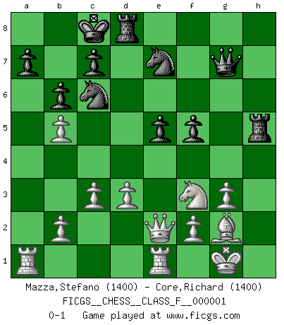 Last move : 0-1 2006 October 5 4:56:22 [Event "FICGS__CHESS__CLASS_F__000001"] [Site "FICGS"] [Date "2006.04.28"] [Round "1"] [White "Mazza,Stefano"] [Black "Core,Richard"] [Result "0-1"] [WhiteElo "1400"] [BlackElo "1400"] 1.e4 b6 2.g3 Bb7 3.Bg2 Nc6 4.Nf3 e5 5.O-O d5 6.exd5 Qxd5 7.Nc3 Qd6 8.Ng5 f6 9.Nge4 Qe6 10.Nb5 O-O-O 11.c3 Be7 12.d3 Ba6 13.a4 f5 14.Ng5 Qg6 15.h4 h6 16.Nf3 Qf6 17.Re1 g5 18.hxg5 hxg5 19.Bxg5 Qg7 20.Bxe7 Ngxe7 21.Qe2 Bxb5 22.axb5 Rh5 0-1 Owen defense Kingside Castling by player White (move 5) Queenside Castling by player Black (move 10) Player Black won this chess game. Follow this game move after move (download)The tactician must know what to do whenever something needs doing; the strategist must know what to do when nothing needs doing. (Savielly Tartakover) Schach ist Leben. (Robert James Fischer) El arma más poderosa en el Ajedrez, es tener la próxima movida. (David Bronstein) Les erreurs sont comme les malheurs, elles n'arrivent jamais seules. (Siegbert Tarrasch) When you don't know what to do, walk fast and look worried. (Anonymous)