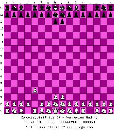 Last move : 1-0 2010 August 14 22:39:17 [Event "FICGS__BIG_CHESS__TOURNAMENT__000068"] [Site "FICGS"] [Date "2010.07.15"] [Round "1"] [White "Ropokis,Dimitrios"] [Black "Vermeulen,Aad"] [Result "1-0"] [WhiteElo ""] [BlackElo ""] 1.e2-e4 1-0 This big chess game has been lost on time (started : 2010.07.15 21:15:21) Follow this game move after move (download)There must have been a time when men were demigods, or they could not have invented Chess. (Gustav Schenk) Das typische an einem Großmeister ist, daß er eine gewonnene Position schnell und schmerzlos gewinnt. (Irving Chernev) El Ajedrez era la lengua materna de Capablanca. (Reti) Des idées, des idées, j'en ai cent, j'en ai mille. Des bonnes, des mauvaises, applicables, irréalisables... Il suffit de faire le tri ! (Roos) Programming can only do so much before it becomes too much. (Don Groves)
