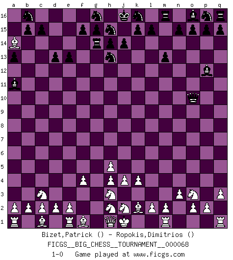 Last move : 1-0 2010 August 4 18:15:36 [Event "FICGS__BIG_CHESS__TOURNAMENT__000068"] [Site "FICGS"] [Date "2010.07.16"] [Round "1"] [White "Bizet,Patrick"] [Black "Ropokis,Dimitrios"] [Result "1-0"] [WhiteElo ""] [BlackElo ""] 1.j3-j4 m15-m13 2.k2-k4 j15-h13 3.h3-h4 l16-p12 4.g2-g4 h16-o10 5.p1-o3 d15-d13 6.n2-n3 c16-p4 7.q2-q3 p4-l8 8.g1-h3 e15-e13 9.k1-j3 f16-a11 10.j3-h5 e16-e14 11.f2-f4 l8-h5 12.g4-h5 e14-g14 13.b1-c3 a15-a13 14.l1-k2 a16-a14 15.o1-a14 1-0 Follow this game move after move (download)Capture of the adverse King is the ultimate but not the first object of the game. (William Steinitz) Schach ist Krieg, im Schach geht es um testosterongesteuerte Urschreie. (Garry Kasparov) Hay dos clases de hombres: aquellos que se conforman en dejarse llevar por las circunstancias y que juegan barajas y aquellos decididos a controlar las circunstancias y que juegan al Ajedrez. (Mortimer Collins) Les Echecs sont affaire de jugement sensible. Savoir quand frapper et quand esquiver. (Fischer) Question: Is 'This statement is paradoxical' a paradoxical statement ? Or is it a meta-paradox ? (Normajean Yates)