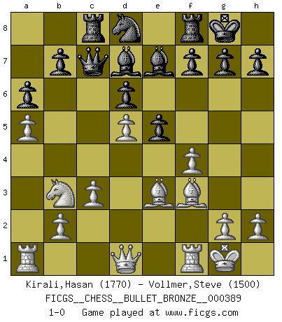 Last move : 1-0 2010 July 16 2:2:55 [Event "FICGS__CHESS__BULLET_BRONZE__000389"] [Site "FICGS"] [Date "2010.07.16"] [Round "1"] [White "Kirali,Hasan"] [Black "Vollmer,Steve"] [Result "1-0"] [WhiteElo "1770"] [BlackElo "1500"] 1.e4 c5 2.Nf3 d6 3.d4 cxd4 4.Nxd4 Nc6 5.Nc3 Nf6 6.Be2 e6 7.O-O Be7 8.Be3 O-O 9.f4 Bd7 10.Nb3 a6 11.a4 Qc7 12.a5 Rac8 13.Bf3 e5 14.Nd5 Nxd5 15.exd5 Nd8 16.c3 1-0 This chess game has been lost on time (started : 2010.07.16 1:50:1) Sicilian Kingside Castling by player White (move 7) Kingside Castling by player Black (move 8) Player White won this chess game. Follow this game move after move (download)No one ever won a game by resigning. (Unknown) Offensichtlich kennt Kasparow nichts anderes als Schach, und ich könnte 500 weitere Spieler dieser Sorte benennen. (Judith Polgar) Un Peón pasado es un criminal, quién debe ser mantenido bajo candado y llave. Leves medidas, tales como vigilancia policiaca, no son suficientes. (Aaron Nimzovich) Le génie consiste à savoir transgresser les règles au moment opportun. (Teichmann) It's not enough to succeed. Others must fail. (Gore Vidal)