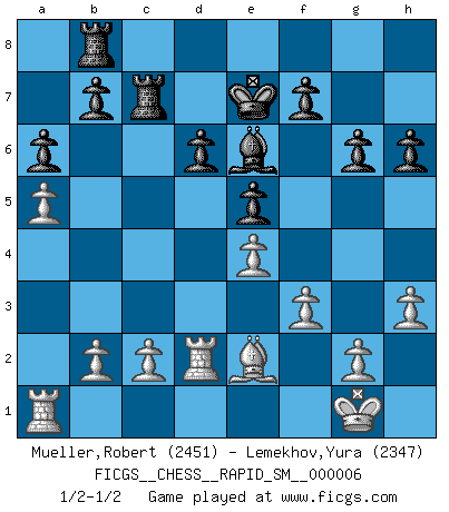 Last move : 1/2-1/2 2010 September 5 6:15:58 [Event "FICGS__CHESS__RAPID_SM__000006"] [Site "FICGS"] [Date "2010.07.17"] [Round "1"] [White "Mueller,Robert"] [Black "Lemekhov,Yura"] [Result "1/2-1/2"] [WhiteElo "2451"] [BlackElo "2347"] 1.e4 c5 2.Nf3 d6 3.d4 cxd4 4.Nxd4 Nf6 5.Nc3 a6 6.Be2 e5 7.Nb3 Be7 8.O-O O-O 9.Be3 Be6 10.Qd2 Nbd7 11.a4 Rc8 12.a5 Qc7 13.Rfd1 Rfd8 14.Nc1 h6 15.h3 Nc5 16.Bf3 Nh7 17.N1e2 Ng5 18.Bxg5 Bxg5 19.Nd5 Bxd2 20.Nxc7 Rxc7 21.Rxd2 Kf8 22.Nc3 Ke7 23.Be2 Rb8 24.f3 g6 25.Na4 Nxa4 26.Rxa4 Bd7 27.Ra1 Be6 1/2-1/2 Sicilian : Najdorf, Opovcensky variation Kingside Castling by player White (move 8) Kingside Castling by player Black (move 8) This chess game ended in a draw. Follow this game move after move (download)A sacrifice is best refuted by accepting it. (Wilhelm Steinitz) Irgendwie scheint mir sonntags früh um 9 Uhr der Killerinstinkt verloren gegangen zu sein. (Alexej Shirov) La mitad de las variaciones que son calculadas en una partida de torneo, resultan ser completamente superfluas. Desafortunadamente, nadie sabe por adelantado cual mitad. (Jan Tinman) Un millionnaire : 'Monsieur Steinitz ! Vous ne participez aux tournois que pour l'argent, alors que moi je n'y viens que pour l'honneur.' Steinitz : 'Chacun joue pour ce qu'il n'a pas'... However beautiful the strategy, you should occasionally look at the results. (Winston Churchill)