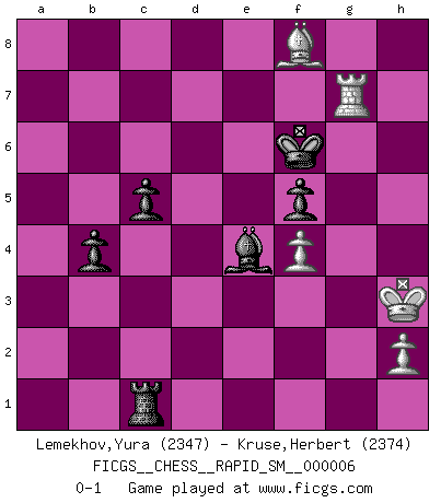 Last move : 0-1 2010 November 25 21:32:22 [Event "FICGS__CHESS__RAPID_SM__000006"] [Site "FICGS"] [Date "2010.07.17"] [Round "1"] [White "Lemekhov,Yura"] [Black "Kruse,Herbert"] [Result "0-1"] [WhiteElo "2347"] [BlackElo "2374"] 1.d4 Nf6 2.c4 e6 3.Nf3 d5 4.Nc3 c6 5.e3 Nbd7 6.Qc2 Bd6 7.Bd3 dxc4 8.Bxc4 O-O 9.O-O b5 10.Be2 a6 11.e4 e5 12.Rd1 Qc7 13.g3 Re8 14.a3 h6 15.b4 Bb7 16.Be3 Ng4 17.Bd2 Rac8 18.Rac1 Qb6 19.Be1 Bf8 20.dxe5 Ngxe5 21.Nxe5 Nxe5 22.Qb1 Red8 23.Qa1 Rxd1 24.Rxd1 Re8 25.Qb1 Bc8 26.Kg2 Be6 27.f4 Ng4 28.Bxg4 Bxg4 29.Bf2 Qc7 30.Rc1 Rd8 31.Be3 Qd7 32.Qc2 Qd3 33.Qxd3 Rxd3 34.Kf2 h5 35.Rc2 h4 36.Rc1 Be7 37.Rc2 h3 38.Ba7 f5 39.e5 Rf3+ 40.Ke1 g5 41.fxg5 Bxg5 42.e6 Be7 43.Bb6 Kf8 44.Kd2 Bg5+ 45.Ke1 Ke7 46.Ne2 Rxa3 47.Nf4 Bxf4 48.gxf4 Bf3 49.Rd2 Kxe6 50.Bc5 Bd5 51.Re2+ Be4 52.Rd2 Kf7 53.Bd6 a5 54.bxa5 Rxa5 55.Bc5 Ra1+ 56.Kf2 Rh1 57.Kg3 Rc1 58.Rd7+ Kg6 59.Bf8 c5 60.Kxh3 b4 61.Rg7+ Kf6 0-1 Queen's pawn game Kingside Castling by player Black (move 8) Kingside Castling by player White (move 9) Player Black won this chess game. Follow this game move after move (download)Who is your opponent tonight, tonight I am playing against the Black pieces. (Akiba Rubinstein) Zu meiner Zeit war ein 20 jähriger ein junger Spieler, heute ist er ein Veteran. (Garry Kasparov) El Ajedrez, como cualquier otra actividad creativa, puede existir solo a través de méritos combinados de aquellos que tienen talento creativo y de aquellos que tienen la habilidad de organizar un trabajo creativo. (Mikhail Botvinnik) La vérité est comme le meilleur coup aux échecs : elle existe, mais il faut la chercher. (Arturo Perez-Reverte) Creativity is allowing yourself to make mistakes. Art is knowing which ones to keep. (Scott Adams)