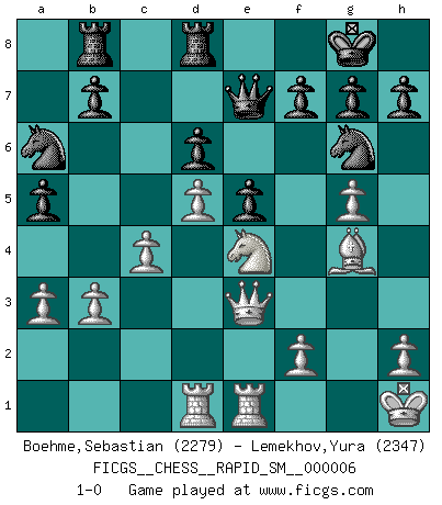 Last move : 1-0 2010 December 4 10:26:29 [Event "FICGS__CHESS__RAPID_SM__000006"] [Site "FICGS"] [Date "2010.07.17"] [Round "1"] [White "Boehme,Sebastian"] [Black "Lemekhov,Yura"] [Result "1-0"] [WhiteElo "2279"] [BlackElo "2347"] 1.e4 c5 2.Nf3 d6 3.d4 cxd4 4.Nxd4 Nf6 5.Nc3 a6 6.Be2 e5 7.Nb3 Be7 8.O-O O-O 9.Be3 Be6 10.Qd3 Nbd7 11.Nd5 Bxd5 12.exd5 Qc7 13.c4 a5 14.Rfe1 Nb8 15.Nd2 Na6 16.b3 Nd7 17.g4 Qd8 18.a3 Bg5 19.Bxg5 Qxg5 20.Qe3 Qe7 21.Bd3 Nac5 22.Bf1 Na6 23.Kh1 Rfe8 24.Be2 Nf8 25.Ne4 Red8 26.g5 Ng6 27.Bg4 Rab8 28.Rad1 1-0 This chess game has been lost on time (started : 2010.07.17 22:6:44) Sicilian : Najdorf, Opovcensky variation Kingside Castling by player White (move 8) Kingside Castling by player Black (move 8) Player White won this chess game. Follow this game move after move (download)The only thing Chess players have in common is Chess. (Lodewijk Prins) Frage: Wie viele Autos haben Sie schon zerstört? - Antwort: Nur zwei. (Loek van Wely) Un entendimiento minucioso de las típicas continuaciones de mate hacen de las mas complicadas combinaciones de sacrificio que conducen hacia ellas no solo no dificiles, sino casi un asunto de rutina. (Siegbert Tarrasch) Soyez une menace à chaque fois que vous vous asseyez pour jouer. (Ken Smith) Cactus - It is depressed cucumber. (Ilmars Cirulis)