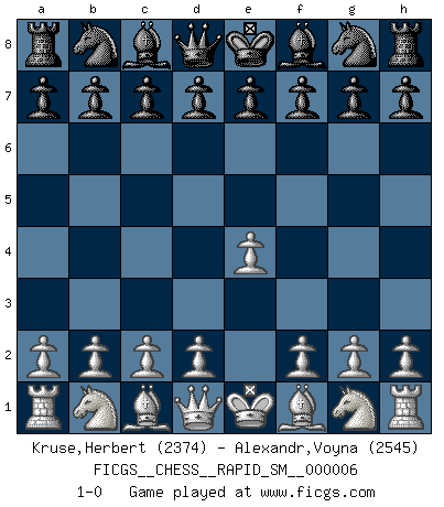 Last move : 1-0 2010 August 17 22:44:25 [Event "FICGS__CHESS__RAPID_SM__000006"] [Site "FICGS"] [Date "2010.07.17"] [Round "1"] [White "Kruse,Herbert"] [Black "Alexandr,Voyna"] [Result "1-0"] [WhiteElo "2374"] [BlackElo "2545"] 1.e4 1-0 This chess game has been lost on time (started : 2010.07.17 22:3:6) King's pawn Opening Player White won this chess game. Follow this game move after move (download)Look at Garry Kasparov. After he loses, invariably he wins the next game. He just kills the next guy. That's something that we have to learn to be able to do. (Maurice Ashley) Über Kasparov: Es ist offensichtlich, daß er in einem totalitären Staat aufwuchs und deshalb zu diktatorischen Zügen neigt. (Viktor Kortschnoi) Todo lo que importa ante el tablero de Ajedrez son buenas jugadas. (Bobby Fischer) Il n'y a pas eu de défaite parce que je ne crois pas que cet ordinateur ait jamais existé. IBM a triché en refusant d'imprimer les modes de recherche de la machine. C'est évident, pendant le match, des coups décisifs ont été joués par des êtres humains. Aujourd'hui, les meilleurs spécialistes en informatique ne peuvent toujours pas expliquer comment Deep-Blue a pu jouer contre la logique des ordinateurs. IBM a gagné une guerre de communication, mais ils sont incapables de prouver que l'ordinateur a gagné tout seul. (Garry Kasparov) When the going gets tactical, the computers get going. (Hyatt)