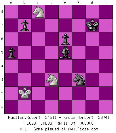 Last move : 0-1 2011 January 29 6:21:56 [Event "FICGS__CHESS__RAPID_SM__000006"] [Site "FICGS"] [Date "2010.07.17"] [Round "1"] [White "Mueller,Robert"] [Black "Kruse,Herbert"] [Result "0-1"] [WhiteElo "2451"] [BlackElo "2374"] 1.e4 c5 2.Nf3 d6 3.d4 cxd4 4.Nxd4 Nf6 5.Nc3 a6 6.Be2 e5 7.Nb3 Be7 8.O-O O-O 9.Be3 Be6 10.Qd2 Nbd7 11.a4 Qc7 12.a5 Rac8 13.Rfd1 Rfe8 14.Qe1 Qb8 15.Bf3 Ng4 16.Bc1 Bh4 17.g3 Bd8 18.h3 Ngf6 19.Bg2 Rc6 20.Be3 h6 21.Rd2 Rc4 22.Kh2 Rc8 23.Qd1 Be7 24.Qe2 Bc4 25.Qe1 Bd8 26.Qd1 Be7 27.h4 Be6 28.f3 Rc4 29.Bf1 R4c8 30.Bh3 Rc4 31.Kg2 Qc8 32.Bxe6 fxe6 33.Bf2 Rf8 34.Qe2 Rc6 35.Rad1 Qe8 36.Rd3 Nh5 37.Qe3 Qf7 38.Kh2 Nb8 39.Nd2 Nf6 40.Qe2 R6c8 41.Bb6 Nbd7 42.Bg1 g5 43.hxg5 hxg5 44.Kg2 g4 45.fxg4 Qg6 46.g5 Qxg5 47.Be3 Qg6 48.Rh1 Ng4 49.Nf3 Nxe3+ 50.Qxe3 Rf4 51.Rh3 Rcf8 52.Qe2 Nb8 53.Kh1 R4f7 54.Nd1 Nc6 55.Nh4 Qg5 56.Nf3 Qg6 57.Nh4 Qg5 58.Nf3 Qg7 59.Nh2 Qg6 60.Kg2 Nd4 61.Qg4 Rg7 62.Qxg6 Rxg6 63.Nf3 Nxc2 64.Rb3 Rb8 65.Nf2 Bd8 66.Rd3 Bxa5 67.Rxd6 Ne3+ 68.Kg1 Rc8 69.Nxe5 Rc1+ 70.Kh2 Bc7 71.Nxg6 Bxd6 72.e5 Rc2 73.Kg1 Rc1+ 74.Kh2 Rc2 75.Kg1 Bc7 76.Nd3 Bb6 77.Kh1 a5 78.b3 Rd2 79.Ndf4 Kg7 80.Rh5 Nf1 81.Rh3 Rd1 82.Rh4 Nxg3+ 83.Kg2 Nf5 84.Rh3 Rg1+ 85.Kf3 Nd4+ 86.Ke4 Re1+ 87.Kd3 Rb1 88.Kd2 Rb2+ 89.Kc1 Rxb3 90.Rxb3 Nxb3+ 91.Kb2 Nd4 92.Ne7 Bc7 93.Nd3 Nf3 94.Nc8 Bxe5+ 0-1 Sicilian : Najdorf, Opovcensky variation Kingside Castling by player White (move 8) Kingside Castling by player Black (move 8) 10 pieces endgame at move 90 : White KNNP , Black KBNPPP WHITE : King + 2 Knights 1 Pawn BLACK : King + 1 Bishop 1 Knight 3 Pawns 9 pieces endgame at move 94 : White KNN , Black KBNPPP WHITE : King + 2 Knights BLACK : King + 1 Bishop 1 Knight 3 Pawns Player Black won this chess game. Follow this game move after move (download)The King is a fighting piece. Use it ! (Wilhelm Steinitz) Es hat in meinem Leben Zeiten gegeben, in denen das Schachspiel, wenn nicht zum Lebenszweck, so doch zu einem regelrechten Lebensersatz geworden ist. Man fühlt sich in solchen Zeiten nicht so, als besäße man eine göttliche Gabe, sondern eher so, als sei man von ihr besessen. (Garry Kasparov) Las piezas de Ajedrez son los bloques del alfabeto que moldean los pensamientos; y esos pensamientos, aunque hagan un diseño visual en el tablero, expresan abstractamente su belleza como un poema. (Marcel Duchamp) La tactique est l'élément le plus important du milieu de jeu. (Siegbert Tarrasch) Faith : not wanting to know what is true. (Friedrich Nietzsche)
