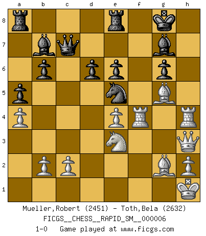 Last move : 1-0 2010 September 13 22:38:21 [Event "FICGS__CHESS__RAPID_SM__000006"] [Site "FICGS"] [Date "2010.07.17"] [Round "1"] [White "Mueller,Robert"] [Black "Toth,Bela"] [Result "1-0"] [WhiteElo "2451"] [BlackElo "2632"] 1.e4 c5 2.Nf3 d6 3.d4 cxd4 4.Nxd4 Nf6 5.Nc3 a6 6.Be2 e6 7.O-O Be7 8.f4 O-O 9.Be3 Nc6 10.a4 Qc7 11.Kh1 Re8 12.Bf3 Na5 13.g4 Bf8 14.g5 Nd7 15.Bg2 b6 16.Qf3 Nc4 17.Bc1 Bb7 18.f5 Nce5 19.Qh3 Nc5 20.g6 hxg6 21.Nf3 Nxf3 22.fxg6 fxg6 23.Qxf3 Re7 24.Qg4 Nd7 25.Bf4 g5 26.Bxg5 Ne5 27.Qh3 R7e8 28.Rf4 g6 29.Rh4 Bg7 30.Rf1 Nd7 31.Nd1 a5 32.Ne3 Ne5 33.R1f4 1-0 Sicilian : Najdorf, Opovcensky variation Kingside Castling by player White (move 7) Kingside Castling by player Black (move 8) Player White won this chess game. Follow this game move after move (download)It is the aim of the modern school, not to treat every position according to one general law, but according to the principle inherent in the position. (Richard Reti) Ich spiele ehrlich und spiele, um zu gewinnen. Wenn ich verliere nehme ich meine Medizin. (Robert James Fischer) Los asuntos humanos son como una partida de Ajedrez: solo aquellos que no lo toman seriamente, pueden ser llamados buenos jugadores. (Hung Tzu Ch'eng) Des idées, des idées, j'en ai cent, j'en ai mille. Des bonnes, des mauvaises, applicables, irréalisables... Il suffit de faire le tri ! (Roos) I live to kill Traxler counterattack. (Ilmars Cirulis)