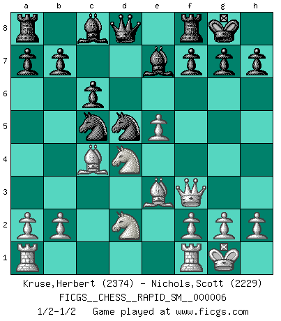 Last move : 1/2-1/2 2010 August 7 13:42:18 [Event "FICGS__CHESS__RAPID_SM__000006"] [Site "FICGS"] [Date "2010.07.17"] [Round "1"] [White "Kruse,Herbert"] [Black "Nichols,Scott"] [Result "1/2-1/2"] [WhiteElo "2374"] [BlackElo "2229"] 1.e4 e5 2.Nf3 Nf6 3.d4 Nxe4 4.Bd3 d5 5.dxe5 Be7 6.O-O Nc5 7.Be2 O-O 8.Be3 c6 9.c4 dxc4 10.Bxc4 Nbd7 11.Nbd2 Nb6 12.Nd4 Nd5 13.Qf3 Nd7 14.Qe4 Nc5 15.Qf3 Nd7 16.Qe4 Nc5 17.Qf3 1/2-1/2 Petrov : Modern attack, Symmetrical variation Kingside Castling by player White (move 6) Kingside Castling by player Black (move 7) This chess game ended in a draw. Follow this game move after move (download)Chess books should be used as we use glasses: to assist the sight, although some players make use of them as if they thought they conferred sight. (Jose Raul Capablanca) Sie führen leise Selbstgespräche, schlürfen lautstark ihre Getränke, schmatzen hörbar beim Essen, blasen ihrem Gegenüber Rauch in die Augen, niesen ihm ins Gesicht, starren ihn unverwandt an, bis er sich unter ihren Blicken windet, rutschen ständig auf ihrem Stuhl hin und her, rülpsen und bohren in der Nase. (Anonymous) Dios mío, Bobby Fischer juega tan simple. (Alexei Suetin) C'est la seule position que je connaisse où les deux camps sont mals. Propos prêtés à V. Anand. The best teachers teach from the heart, not from the book. (Author unknown)