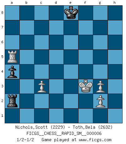 Last move : 1/2-1/2 2010 August 16 9:55:27 [Event "FICGS__CHESS__RAPID_SM__000006"] [Site "FICGS"] [Date "2010.07.17"] [Round "1"] [White "Nichols,Scott"] [Black "Toth,Bela"] [Result "1/2-1/2"] [WhiteElo "2229"] [BlackElo "2632"] 1.e4 c5 2.Nc3 d6 3.f4 g6 4.Nf3 Bg7 5.Bc4 Nc6 6.O-O e6 7.d4 cxd4 8.Nb5 Nge7 9.Bb3 O-O 10.Nbxd4 Na5 11.Be3 a6 12.c4 Qc7 13.Rc1 b6 14.Qd2 Nxb3 15.axb3 Rb8 16.b4 e5 17.Ne2 f5 18.Ng3 fxe4 19.Ng5 a5 20.fxe5 Rxf1+ 21.Rxf1 Bxe5 22.Bd4 e3 23.Qxe3 Bf5 24.Nf3 Bxg3 25.hxg3 Nc6 26.bxa5 bxa5 27.Bc3 Qb6 28.Nd4 Qc5 29.Nxf5 gxf5 30.Qxc5 dxc5 31.Rxf5 Nd4 32.Rg5+ Kf8 33.Kf2 Nb3 34.Rg7 Rb4 35.Rxh7 Rxc4 36.Rh4 Nd4 37.Ke3 Ra4 38.Rh7 Ke8 39.Rc7 Nb5 40.Rxc5 Nxc3 41.bxc3 Ra2 42.Kf3 a4 43.Ra5 1/2-1/2 Sicilian : Closed Kingside Castling by player White (move 6) Kingside Castling by player Black (move 9) 10 pieces endgame at move 40 : White KRBPPP , Black KRNP WHITE : King + 1 Rook 1 Bishop 3 Pawns BLACK : King + 1 Rook 1 Knight 1 Pawn 9 pieces endgame at move 40 : White KRPPP , Black KRNP WHITE : King + 1 Rook 3 Pawns BLACK : King + 1 Rook 1 Knight 1 Pawn 8 pieces endgame at move 41 : White KRPPP , Black KRP WHITE : King + 1 Rook 3 Pawns BLACK : King + 1 Rook 1 Pawn This chess game ended in a draw. Follow this game move after move (download)A thorough understanding of the typical mating continuations makes the most complicated sacrificial combinations leading up to them not only not difficult, but almost a matter of course. (Siegbert Tarrasch) Charakterschwächen offenbaren sich normalerweise während einer Schachpartie. (Garry Kasparov) El Ajedrez es un cuento de Hadas de las 1001 metidas de pata. (Savielly Tartakower) Ce qui caractérise les parties de combat, c'est que si le défenseur a constamment de difficiles problèmes à résoudre, l'attaquant doit chercher sans relâche de nouvelles possibilités d'attaque. (Koblentz) It's not enough to succeed. Others must fail. (Gore Vidal)
