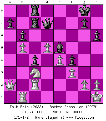 Last move : 1/2-1/2 2010 October 24 13:22:45 [Event "FICGS__CHESS__RAPID_SM__000006"] [Site "FICGS"] [Date "2010.07.17"] [Round "1"] [White "Toth,Bela"] [Black "Boehme,Sebastian"] [Result "1/2-1/2"] [WhiteElo "2632"] [BlackElo "2279"] 1.d4 d5 2.c4 e6 3.Nc3 Nf6 4.cxd5 exd5 5.Bg5 Be7 6.e3 c6 7.Qc2 O-O 8.Bd3 h6 9.Bh4 Re8 10.Nge2 b6 11.O-O Ba6 12.Bxf6 Bxf6 13.Bxa6 Nxa6 14.Qa4 Qc8 15.Rac1 Qb7 16.Nf4 Be7 17.Nd3 Rac8 18.b4 Nc7 19.Qb3 Nb5 20.a4 Nd6 21.b5 cxb5 22.axb5 Nc4 23.Ne5 Bd6 24.Nxc4 dxc4 25.Qa4 f5 26.Ra1 Bb8 27.Qd1 f4 28.e4 Qd7 29.f3 Rcd8 30.d5 Be5 31.Qc2 Rc8 32.Rfc1 Rc7 33.Rab1 Bd4+ 34.Kh1 Be5 35.Qa2 Rec8 36.Rc2 1/2-1/2 QGD : Exchange, positional line Kingside Castling by player Black (move 7) Kingside Castling by player White (move 11) This chess game ended in a draw. Follow this game move after move (download)Pawn endings are to Chess what putting is to golf. (Cecil Purdy) Über Frauen: Chess is better. (Robert James Fischer) Un entendimiento minucioso de las típicas continuaciones de mate hacen de las mas complicadas combinaciones de sacrificio que conducen hacia ellas no solo no dificiles, sino casi un asunto de rutina. (Siegbert Tarrasch) Je ne crois pas en la psychologie, je crois aux bons coups. (Robert Fischer) Being number two sucks. (Andre Agassi)