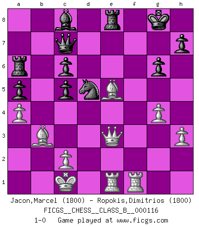 Last move : 1-0 2010 July 20 14:4:26 [Event "FICGS__CHESS__CLASS_B__000116"] [Site "FICGS"] [Date "2010.07.19"] [Round "1"] [White "Jacon,Marcel"] [Black "Ropokis,Dimitrios"] [Result "1-0"] [WhiteElo "1800"] [BlackElo "1800"] 1.d4 d5 2.Nc3 Nf6 3.e4 dxe4 4.f3 exf3 5.Nxf3 g6 6.Bc4 Bg7 7.Bf4 O-O 8.Qd2 Bf5 9.h3 Nbd7 10.O-O-O Nb6 11.Bb3 c6 12.g4 Ne4 13.Qe2 Nxc3 14.bxc3 Bd7 15.c4 a5 16.a4 Re8 17.Ne5 Bc8 18.Rhf1 f6 19.Nd3 e6 20.Nc5 Qe7 21.Ne4 e5 22.dxe5 fxe5 23.c5 Nd5 24.Bg5 Qc7 25.Nf6+ Bxf6 26.Bxf6 b6 27.Qe3 Ra6 28.Rde1 bxc5 29.Bxe5 1-0 Blackmar-Diemer gambit Kingside Castling by player Black (move 7) Queenside Castling by player White (move 10) Player White won this chess game. Follow this game move after move (download)A win by an unsound combination, however showy, fills me with artistic horror. (Wilhelm Steinitz) Sehr viele beherrschen heutzutage das große Einmalseins des Schachspiels und kennen sogar dessen Logarithmentafeln auswendig - deshalb sollte man hin und wieder zu beweisen trachten, dass zwei mal zwei auch fünf sein kann. (Mikhail Nekhemyevich Tal) El sobresalir en el Ajedrez es un signo de una mente intrigante. (Sir Arthur Conan Doyle) Il vaut mieux sacrifier les pièces de l'adversaire. (Xavier Tartacover) It's only after you lost everything, Tyler says, that you're free to do anything. (Chuck Palahniuk, Fight Club)