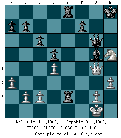 Last move : 0-1 2010 July 23 16:2:6 [Event "FICGS__CHESS__CLASS_B__000116"] [Site "FICGS"] [Date "2010.07.19"] [Round "1"] [White "Nellutla,Manobhiram"] [Black "Ropokis,Dimitrios"] [Result "0-1"] [WhiteElo "1800"] [BlackElo "1800"] 1.d4 d5 2.e3 Nf6 3.a3 Bf5 4.Nc3 e6 5.Bd3 c6 6.h3 Nbd7 7.Nf3 Bd6 8.O-O O-O 9.Nh4 Bxd3 10.Qxd3 Re8 11.Bd2 e5 12.Rae1 e4 13.Qe2 g6 14.f3 Bg3 15.fxe4 Bxh4 16.Rd1 Nxe4 17.Na4 Ng3 18.Qf3 Nxf1 19.Rxf1 Qf6 20.Qg4 Qe7 21.Rf4 g5 22.Rf5 Nf6 23.Qf3 Ne4 24.Bb4 Qe6 25.Re5 Qg6 26.Rf5 Bf2+ 27.Kf1 Bxe3 28.Nc5 Nd2+ 29.Bxd2 Bxd2 30.Nd7 Re1+ 31.Kf2 Re3 32.Qg4 h5 33.Nf6+ Kh8 34.Nxh5 Rae8 35.Rxg5 Re2+ 36.Kg1 Bxg5 0-1 Queen's pawn game Kingside Castling by player White (move 8) Kingside Castling by player Black (move 8) Player Black won this chess game. Follow this game move after move (download)I won't play with you anymore. You have insulted my friend. - When an opponent cursed himself for a blunder. (Miguel Najdorf) Privat ist Kortschnoi kein schlechter Mensch, sehr sympathisch. Aber während des Spiels ist er grausam. Er will dich töten. (Miguel Najdorf) El tablero es el mundo, las piezas es el fenomeno del universo, las reglas del juego son lo que llamamos leyes de la naturaleza y el jugador del lado opuesto, se encuentra oculto a nuestra vista. (Thomas Huxley) Aux échecs, l'amour-propre est satisfait quand on remporte la victoire, mais il n'y a pas de honte à être battu. (Benjamin Franklin) Tree pose grows confidence. It roots me to this world. (Terri Guillemets)