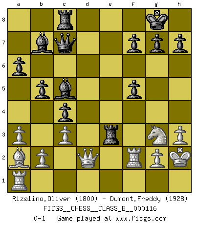 Last move : 0-1 2010 November 26 10:44:44 [Event "FICGS__CHESS__CLASS_B__000116"] [Site "FICGS"] [Date "2010.07.19"] [Round "1"] [White "Rizalino,Oliver"] [Black "Dumont,Freddy"] [Result "0-1"] [WhiteElo "1800"] [BlackElo "1928"] 1.e4 c5 2.Bc4 e6 3.Nf3 d6 4.Nc3 Nf6 5.d3 Be7 6.O-O O-O 7.a3 Nc6 8.h3 a6 9.Bf4 b5 10.Ba2 Qb6 11.Ne2 Re8 12.c3 Bb7 13.Ng3 Rac8 14.Be3 Qc7 15.Ne1 d5 16.f4 dxe4 17.dxe4 c4 18.e5 Nd5 19.Qe2 Nxe5 20.fxe5 Nxe3 21.Rf2 Bc5 22.Kh2 Qxe5 23.Nf3 Qc7 24.Nd4 Nf5 25.Ndxf5 exf5 26.Qd2 Re3 0-1 This chess game has been lost on time (started : 2010.07.19 13:56:27) Sicilian defense Kingside Castling by player White (move 6) Kingside Castling by player Black (move 6) Player Black won this chess game. Follow this game move after move (download)You know, comrade Pachman, I don't enjoy being a Minister, I would rather play Chess like you. (Che Guevara) Als er Schachweltmeister wurde ließ er praktisch alle stärksten Sovietspieler für sich arbeiten. Wenn ein auch nur mittelmässiger Meister ein Spezialist für eine bestimmte Eröffnung war, wurde er von Karpov gerufen. Das wurde alles geheim gehalten. (Mikhail Moiseyevich Botvinik) El Ajedrez no es una pizca de inferior al violín, y tenemos un gran número de violinistas profesionales. (Mikhail Botvinnik) Des idées, des idées, j'en ai cent, j'en ai mille. Des bonnes, des mauvaises, applicables, irréalisables... Il suffit de faire le tri ! (Roos) A mistake is only a mistake if you let it happen twice. Otherwise it is a learning experience. (Daniel Parmet)