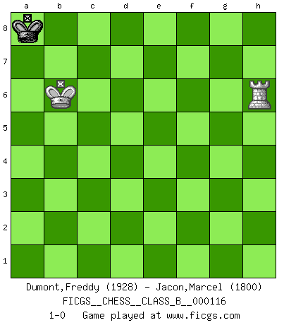 Last move : 1-0 2010 July 23 23:34:14 [Event "FICGS__CHESS__CLASS_B__000116"] [Site "FICGS"] [Date "2010.07.19"] [Round "1"] [White "Dumont,Freddy"] [Black "Jacon,Marcel"] [Result "1-0"] [WhiteElo "1928"] [BlackElo "1800"] 1.e4 d6 2.d4 Nf6 3.Nc3 Nbd7 4.Nf3 e5 5.Bc4 Be7 6.O-O h6 7.Qe2 O-O 8.Rd1 exd4 9.Nxd4 c6 10.Bf4 Re8 11.Be3 Qa5 12.a3 Ne5 13.Bb3 Qc7 14.h3 Bf8 15.a4 Qa5 16.Re1 Bd7 17.f4 Ng6 18.Qd3 Nh5 19.Rf1 Ngxf4 20.Bxf4 Nxf4 21.Rxf4 Be6 22.Nxe6 fxe6 23.Raf1 d5 24.Kh1 Rad8 25.Rf7 Kh8 26.e5 Qa6 27.Qxa6 bxa6 28.Rxa7 Ra8 29.R1f7 a5 30.Ne2 c5 31.Rxa8 Rxa8 32.c3 g5 33.Bc2 Kg8 34.Rc7 Bg7 35.Rxc5 Bxe5 36.Nd4 Bxd4 37.cxd4 Ra6 38.Bd1 Kg7 39.Kh2 Kg6 40.Be2 Ra7 41.Rc6 Re7 42.Bg4 Kf7 43.Ra6 Rb7 44.Bxe6+ Ke7 45.Bxd5 Rxb2 46.Bf3 Rb4 47.Rxa5 Rxd4 48.Ra6 Rb4 49.a5 Ra4 50.Ra7+ Kd8 51.a6 Ra1 52.Bg4 h5 53.Rd7+ Ke8 54.a7 hxg4 55.Rh7 gxh3 56.a8Q+ Rxa8 57.Rh8+ Kf7 58.Rxa8 hxg2 59.Ra6 g1Q+ 60.Kxg1 Kg7 61.Kg2 Kf7 62.Kg3 Ke7 63.Kg4 Kd7 64.Kxg5 Kc7 65.Kf6 Kb7 66.Re6 Kc7 67.Ke7 Kb8 68.Kd7 Kb7 69.Rh6 Kb8 70.Kc6 Ka8 71.Kb6 1-0 Pirc defense Kingside Castling by player White (move 6) Kingside Castling by player Black (move 7) 10 pieces endgame at move 47 : White KRBPPP , Black KRPP WHITE : King + 1 Rook 1 Bishop 3 Pawns BLACK : King + 1 Rook 2 Pawns 9 pieces endgame at move 54 : White KRPPP , Black KRPP WHITE : King + 1 Rook 3 Pawns BLACK : King + 1 Rook 2 Pawns 8 pieces endgame at move 55 : White KRPP , Black KRPP WHITE : King + 1 Rook 2 Pawns BLACK : King + 1 Rook 2 Pawns Promotion Queen by player White (move 56) 7 pieces endgame at move 56 : White KRP , Black KRPP WHITE : King + 1 Rook 1 Pawn BLACK : King + 1 Rook 2 Pawns 6 pieces endgame at move 58 : White KRP , Black KPP WHITE : King + 1 Rook 1 Pawn BLACK : King + 2 Pawns 5 pieces endgame at move 58 : White KR , Black KPP WHITE : King + 1 Rook BLACK : King + 2 Pawns Promotion Queen by player Black (move 59) 4 pieces endgame at move 60 : White KR , Black KP WHITE : King + 1 Rook BLACK : King + 1 Pawn 3 pieces endgame at move 64 : White KR , Black K WHITE : King + 1 Rook BLACK : King + Player White won this chess game. Follow this game move after move (download)Half the variations which are calculated in a tournament game turn out to be completely superfluous. Unfortunately, no one knows in advance which half. (Jan Tinman) Drei Punkte vor allen anderen ist wie einer, der im weißen Anzug posiert, während der Rest in Müllsäcke gekleidet dasteht. (Viktor Kortschnoi) Ayuda a tus piezas para que ellas te puedan ayudar. (Paul Morphy) Les échecs sont un jeu par leur forme, un art par leur essence et une science par sa difficulté d'acquisition. Ils peuvent vous procurer autant de plaisir qu'un bon livre ou une belle musique, mais vous n'aurez une réelle joie que si vous arrivez à bien jouer. (Tigran Petrosian) Good decisions come from experience, and experience comes from bad decisions. (Anonymous)