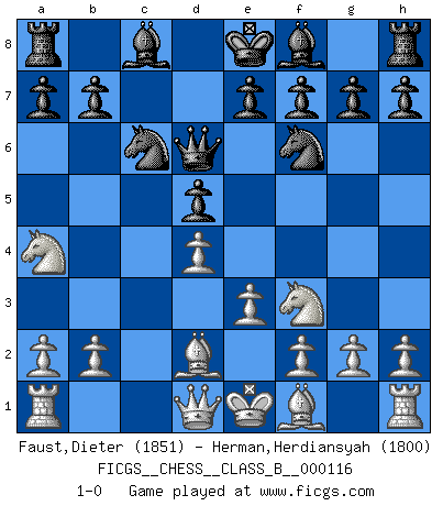 Last move : 1-0 2010 September 13 20:47:46 [Event "FICGS__CHESS__CLASS_B__000116"] [Site "FICGS"] [Date "2010.07.19"] [Round "1"] [White "Faust,Dieter"] [Black "Herman,Herdiansyah"] [Result "1-0"] [WhiteElo "1851"] [BlackElo "1800"] 1.d4 d5 2.c4 c6 3.cxd5 cxd5 4.Nc3 Nc6 5.Nf3 Nf6 6.Bf4 Qb6 7.Na4 Qb4+ 8.Bd2 Qd6 9.e3 1-0 This chess game has been lost on time (started : 2010.07.19 13:56:27) QGD Slav defense : Exchange variation Player White won this chess game. Follow this game move after move (download)Fischer was a master of clarity and a king of artful positioning. His opponents would see where he was going but were powerless to stop him. (Bruce Pandolfini) Wenn ein Kopf und ein Buch zusammenstoßen und es klingt hohl, ist es denn allemal im Buche? (Georg Christoph Lichtenberg) Tu eres para mi la Reina en d8 y yo soy el Peón en d7!!. (GM Eduard Gufeld) Vous savez, camarade Pachman, je n'éprouve pas de plaisir à être ministre, je jouerais plutôt aux échecs comme vous, ou alors ferais une révolution au Venezuela. (Che Guevara à Ludek Pachman, 'Checkmate in Prague', 1975) Looking at the proliferation of personal web pages on the Net, it looks like very soon everyone on Earth will have 15 megabytes of fame. (M.G. Sriram)