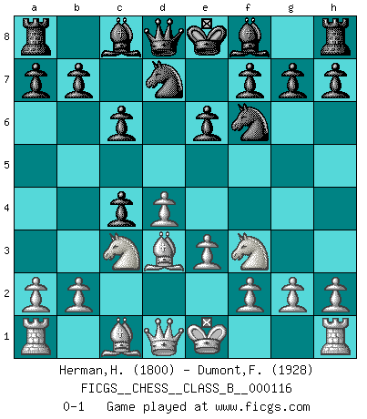 Last move : 0-1 2010 August 30 10:52:7 [Event "FICGS__CHESS__CLASS_B__000116"] [Site "FICGS"] [Date "2010.07.19"] [Round "1"] [White "Herman,Herdiansyah"] [Black "Dumont,Freddy"] [Result "0-1"] [WhiteElo "1800"] [BlackElo "1928"] 1.d4 Nf6 2.c4 c6 3.Nc3 d5 4.Nf3 e6 5.e3 Nbd7 6.Bd3 dxc4 0-1 This chess game has been lost on time (started : 2010.07.19 13:56:27) Queen's pawn game Player Black won this chess game. Follow this game move after move (download)When you play Bobby, it is not a question if you win or lose. It is a question if you survive. (Boris Spassky) Es gibt zwei Arten von Opfern: Korrekte und meine. (Mikhail Nekhemyevich Tal) Yo jugué Ajedrez con el y a veces le pude haber ganado solo que siempre devuelve su última jugada y juega la partida de manera diferente. (Mark Twain) Mais l'homme est une créature légère et illogique : semblable au joueur d'échecs, il n'aime que le processus du but à atteindre, non le but lui-même. (Dostoïevsky) No enterprise is more likely to succeed than one concealed from the enemy until it is ripe for execution. (Niccolo Machiavelli)