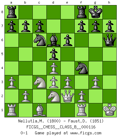 Last move : 0-1 2010 August 10 21:55:34 [Event "FICGS__CHESS__CLASS_B__000116"] [Site "FICGS"] [Date "2010.07.19"] [Round "1"] [White "Nellutla,Manobhiram"] [Black "Faust,Dieter"] [Result "0-1"] [WhiteElo "1800"] [BlackElo "1851"] 1.d4 d5 2.e3 Nf6 3.a3 Bf5 4.Nf3 e6 5.h3 Bd6 6.Bd3 Nc6 7.Nc3 O-O 8.O-O Ne4 9.Nd2 Qh4 10.Nf3 Qf6 11.Nd2 Qg6 12.Qf3 Ng5 13.Qe2 Nxh3+ 14.Kh1 Bxd3 15.cxd3 Qh6 16.g3 Nf4 0-1 Queen's pawn game Kingside Castling by player Black (move 7) Kingside Castling by player White (move 8) Player Black won this chess game. Follow this game move after move (download)You are for me the Queen on d8 and I am the Pawn on d7 !! (Eduard Gufeld) Der Knackpunkt bei der Konzentration ist, daß wir nur durch sie etwas Neues und Ungewöhnliches am Schachbrett finden können. Sie ist der einzige Weg durch neue neue Ideen eine Überraschung zu bereiten. (Garry Kasparov) Una compensación adecuada por un sacrificio es tener una combinación sólida que conduce a una posición ganadora; una compensación adecuada por una metida de pata es dejar a tu oponente arrebatar una derrota de las fauces de la victoria. (Bruce A. Moon) Un millionnaire : 'Monsieur Steinitz ! Vous ne participez aux tournois que pour l'argent, alors que moi je n'y viens que pour l'honneur.' Steinitz : 'Chacun joue pour ce qu'il n'a pas'... If you work for a living, why do you kill yourself working ? (Tuco to a chicken in The Good, The Bad and The Ugly)