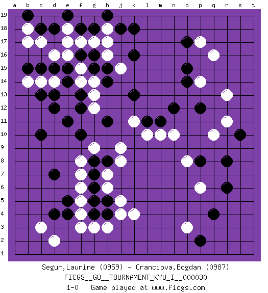 Last move : 1-0 2011 March 10 11:40:18 [Event "FICGS__GO__TOURNAMENT_KYU_I__000030"] [Site "FICGS"] [Date "2010.07.19"] [Round "1"] [Black "Segur,Laurine"] [White "Cranciova,Bogdan"] [Result "1-0"] [Rating 1 "0959"] [Rating 2 "0987"] 1.d4 q16 2.q4 d16 3.c10 k4 4.k16 q10 5.g16 c14 6.d7 f3 7.r8 o3 8.h4 h3 9.g4 g3 10.e4 j4 11.d12 r13 12.s10 r11 13.p2 d2 14.o17 p17 15.o15 e17 16.f18 h6 17.h5 j5 18.g6 h7 19.d18 c17 20.c18 p6 21.r6 k11 22.n12 n10 23.k13 j9 24.p8 o8 25.h11 f14 26.f13 g9 27.f10 f4 28.g5 c3 29.c13 e18 30.e19 f17 31.g18 g17 32.j18 f6 33.g7 f7 34.g8 f8 35.h8 j8 36.e5 f5 37.l11 l10 38.m11 m10 39.p12 p14 40.o14 b18 41.b19 b17 42.c15 b14 43.d15 d14 44.e15 f15 45.e14 e13 46.d13 e12 47.b15 g13 48.f12 h18 49.h19 h17 50.k18 h16 51.f16 e16 52.g15 g14 53.h15 g12 54.e11 j15 55.h14 1-0 This go game has been lost on time (started : 2010.07.19 18:9:0) Here are the names of the openings (joseki) played in the four corners : Corner d16 : d16 g16 Hoshi (Hwajeom, Seongjeom, Xingwei`) 4-4 Point. The star or hoshi (4-4) point, emphasizing influence at the potential expense of territory. Niken Takagakari (Dukan Nop'dakeolch'im, E`r Gaojia, 2-Space High Approach). Black 2 is a light approach move. Rarely played in even games, Black 2 is typically employed in handicap games. White continues with 6-4 or 3-10. In Korean Sunjang Baduk White has a stone on 8-4. Player Black won this Go (weiqi, baduk) game. Follow this game move after move (download)The rectangular six is normally alive. (Anonymous) If you are good, you will be assigned all the work. If you are really good, you will get out of it. (Dan Rotaru)