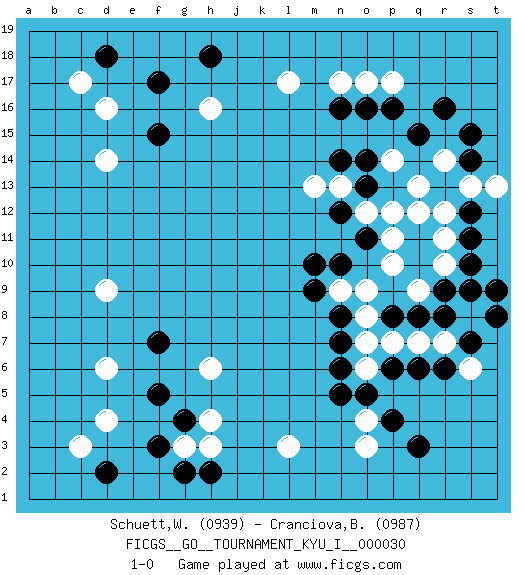 Last move : 1-0 2010 November 28 16:13:42 [Event "FICGS__GO__TOURNAMENT_KYU_I__000030 "] [Site "FICGS"] [Date "2010.07.19"] [Round "1"] [Black "Schuett,Wilhelm "] [White "Cranciova,Bogdan "] [Result "1-0"] [Rating 1 "0939"] [Rating 2 "0987"] 1.r16 d4 2.q3 d16 3.f3 h4 4.f5 d6 5.d2 c3 6.h2 g3 7.g2 h6 8.g4 h3 9.f7 d9 10.f17 h16 11.f15 d14 12.d18 c17 13.h18 p17 14.r13 l17 15.r8 o3 16.p4 l3 17.n16 n17 18.o16 o17 19.p16 r10 20.p8 p10 21.n8 q12 22.n10 o12 23.n12 p14 24.q15 n13 25.o11 p11 26.o13 p12 27.n14 q9 28.q8 r12 29.s11 s13 30.s12 r14 31.s10 r11 32.s14 q13 33.s15 m13 34.o14 n9 35.m9 o9 36.m10 o8 37.n7 o7 38.n6 o6 39.n5 s9 40.r9 s8 41.s7 s6 42.t8 r7 43.t9 o4 44.o5 t13 45.p6 p7 46.q6 q7 47.r6 s8 48.s9 1-0 Here are the names of the openings (joseki) played in the four corners : Corner d4 : d4 f3Hoshi (Hwajeom, Seongjeom, Xingwei`) 4-4 Point. The star or hoshi (4-4) point, emphasizing influence at the potential expense of territory.Ikken Kakari (Hankan Keolch'im, Yi Gua`jiao~, 1-Space Low Approach). Black 2 is the standard approach move to the 4-4. Corner d16 : d16 f17Hoshi (Hwajeom, Seongjeom, Xingwei`) 4-4 Point. The star or hoshi (4-4) point, emphasizing influence at the potential expense of territory.Ikken Kakari (Hankan Keolch'im, Yi Gua`jiao~, 1-Space Low Approach). Black 2 is the standard approach move to the 4-4. Corner q16 : r16 p17Komoku (Somok, Xiao~mu`) 3-4 Point. The komoku (3-4) point is the traditional corner enclosure move..Ikken Kakari (Hankan Keolch'im, Yi Gua`jiao~, 1-Space Low Pincer). The small knight move is the basic approach move to the 3-4 point stone. It has been continually used for over four centuries. There are limitless variations, with new moves constantly being discovered. White 2 opens the door to a treaure store of joseki. Player Black won this Go (weiqi, baduk) game.Follow this game move after move (download ) There is death in the hane. (Anonymous) Gambling is the son of avarice and the father of despair. (French proverb)