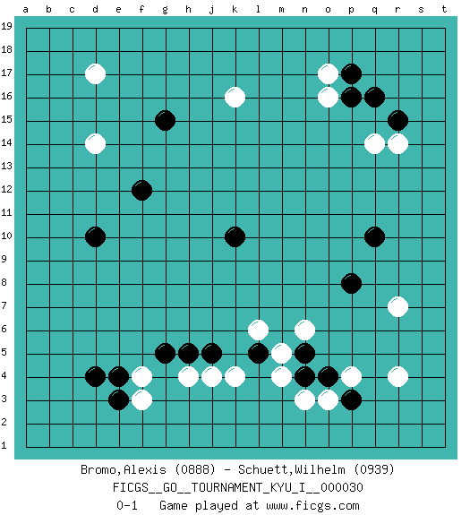 Last move : 0-1 2010 October 4 21:21:30 [Event "FICGS__GO__TOURNAMENT_KYU_I__000030"] [Site "FICGS"] [Date "2010.07.19"] [Round "1"] [Black "Bromo,Alexis"] [White "Schuett,Wilhelm"] [Result "0-1"] [Rating 1 "0888"] [Rating 2 "0939"] 1.q16 d17 2.d4 r4 3.k10 o17 4.p17 o16 5.p16 r14 6.r15 q14 7.q10 k4 8.d10 k16 9.g15 d14 10.f12 f3 11.e3 f4 12.e4 r7 13.p8 o3 14.n5 m4 15.h5 h4 16.g5 j4 17.j5 l6 18.l5 m5 19.n4 n6 20.o4 n3 21.p3 p4 0-1 This go game has been lost on time (started : 2010.07.19 18:9:0) Here are the names of the openings (joseki) played in the four corners : Corner q16 : q16 o17 Hoshi (Hwajeom, Seongjeom, Xingwei`) 4-4 Point. The star or hoshi (4-4) point, emphasizing influence at the potential expense of territory. Ikken Kakari (Hankan Keolch'im, Yi Gua`jiao~, 1-Space Low Approach). White 2 is the standard approach move to the 4-4. Corner d16 : d17 g15 Komoku (Somok, Xiao~mu`) 3-4 Point. The komoku (3-4) point is the traditional corner enclosure move.. Corner d4 : d4 f3 Hoshi (Hwajeom, Seongjeom, Xingwei`) 4-4 Point. The star or hoshi (4-4) point, emphasizing influence at the potential expense of territory. Ikken Kakari (Hankan Keolch'im, Yi Gua`jiao~, 1-Space Low Approach). White 2 is the standard approach move to the 4-4. Player White won this Go (weiqi, baduk) game. Follow this game move after move (download)The weak player fears ko, the strong player seeks it. (Bill Taylor) I have opinions of my own - strong opinions - but I don't always agree with them. (George Bush)