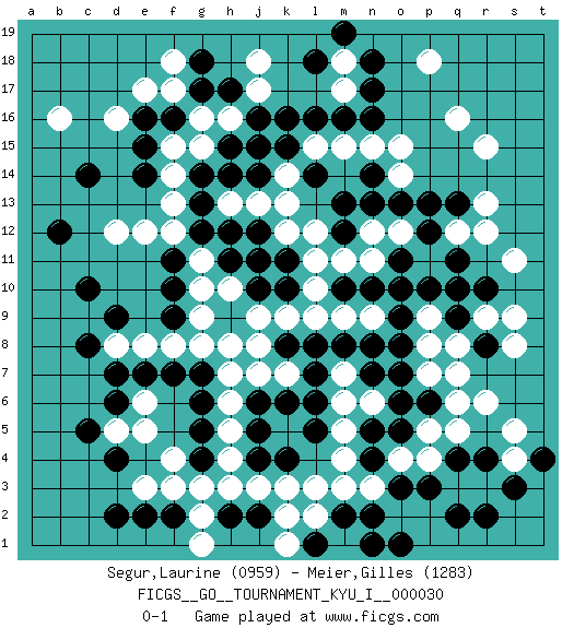 Last move : 0-1 2011 January 13 2:13:52 [Event "FICGS__GO__TOURNAMENT_KYU_I__000030"] [Site "FICGS"] [Date "2010.07.19"] [Round "1"] [Black "Segur,Laurine"] [White "Meier,Gilles"] [Result "0-1"] [Rating 1 "0959"] [Rating 2 "1283"] 1.d4 q16 2.q4 d16 3.c10 q10 4.k4 r6 5.c14 f17 6.k10 m17 7.h14 f3 8.g4 g3 9.d2 f4 10.g6 e5 11.d6 d5 12.c5 e6 13.d7 h4 14.g5 j3 15.n4 k3 16.f2 e3 17.e2 g2 18.j4 h5 19.j6 l3 20.m2 l2 21.j2 m3 22.n2 n3 23.o3 m4 24.n5 m5 25.n7 h6 26.g7 j7 27.k6 k7 28.l6 m6 29.l7 n6 30.o6 m7 31.l8 o4 32.o5 p4 33.p3 p5 34.p6 q5 35.r4 q6 36.o8 p8 37.m8 h7 38.h9 g8 39.f7 f8 40.e7 h8 41.f10 j9 42.j10 k9 43.k8 l9 44.m10 n9 45.n8 m9 46.o9 p7 47.o7 j8 48.n10 l10 49.o11 l12 50.m12 h10 51.h11 g10 52.f9 g9 53.h2 g1 54.l1 q3 55.q2 m1 56.n1 k1 57.o1 r15 58.h17 j18 59.g18 f18 60.r8 q7 61.q9 p9 62.p10 r9 63.r10 s9 64.q11 q8 65.q10 r3 66.s3 s4 67.r2 s8 68.t4 s5 69.p13 r13 70.n14 g11 71.j12 l11 72.l14 b16 73.e14 j11 74.k11 k12 75.j11 j13 76.h12 h13 77.g12 k14 78.k16 f12 79.g13 f13 80.g14 f14 81.j14 k13 82.k15 e8 83.d9 d8 84.c8 d12 85.f16 f15 86.e16 e17 87.e15 g16 88.g17 j15 89.h15 h16 90.j16 g15 91.j15 j17 92.f11 e12 93.b12 l15 94.l16 m15 95.m16 n15 96.n16 o15 97.n17 m18 98.n18 p18 99.m19 o14 100.l18 n12 101.n13 o12 102.o13 m11 103.m13 n11 104.p12 s11 105.j5 k2 106.o10 h3 107.l5 q12 108.q13 r12 0-1 Here are the names of the openings (joseki) played in the four corners : Corner q4 : q4 r6 Hoshi (Hwajeom, Seongjeom, Xingwei`) 4-4 Point. The star or hoshi (4-4) point, emphasizing influence at the potential expense of territory. Ikken Kakari (Hankan Keolch'im, Yi Gua`jiao~, 1-Space Low Approach). White 2 is the standard approach move to the 4-4. Corner d16 : d16 c14 Hoshi (Hwajeom, Seongjeom, Xingwei`) 4-4 Point. The star or hoshi (4-4) point, emphasizing influence at the potential expense of territory. Ikken Kakari (Hankan Keolch'im, Yi Gua`jiao~, 1-Space Low Approach). Black 2 is the standard approach move to the 4-4. Corner d4 : d4 f3 Hoshi (Hwajeom, Seongjeom, Xingwei`) 4-4 Point. The star or hoshi (4-4) point, emphasizing influence at the potential expense of territory. Ikken Kakari (Hankan Keolch'im, Yi Gua`jiao~, 1-Space Low Approach). White 2 is the standard approach move to the 4-4. Player White won this Go (weiqi, baduk) game. Follow this game move after move (download)Go uses the most elemental materials and concepts - line and circle, wood and stone, black and white - combining them with simple rules to generate subtle strategies and complex tactics that stagger the imagination. (Iwamoto Kaoru, 9 dan professional Go player and former Honinbo title holder) As a goal marker shodan is important. As a destination it is a poor place to stop. (Thomas Tamayo)