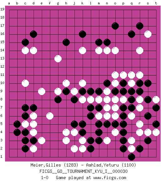 Last move : 1-0 2010 October 5 21:10:38 [Event "FICGS__GO__TOURNAMENT_KYU_I__000030 "] [Site "FICGS"] [Date "2010.07.19"] [Round "1"] [Black "Meier,Gilles "] [White "Aahlad,Yeturu "] [Result "1-0"] [Rating 1 "1283"] [Rating 2 "1100"] 1.q16 d4 2.d16 r4 3.p3 n3 4.p5 q6 5.l3 o4 6.p4 l4 7.k4 k3 8.j3 k2 9.m4 l5 10.m3 j4 11.k5 h3 12.j5 h4 13.l2 j2 14.l6 n6 15.n5 o6 16.o5 q2 17.p2 r14 18.o17 s16 19.r17 r11 20.k16 c14 21.c15 d14 22.c6 d6 23.c4 c5 24.b5 d5 25.b4 k10 26.c7 c10 27.c2 d2 28.d3 e3 29.c3 k14 30.h15 g13 31.r2 q3 32.q1 m6 33.m5 r5 34.d7 o14 35.m15 m14 36.n15 n14 37.l7 m8 38.p6 p8 39.m7 n7 40.n8 o7 41.p7 o8 42.q7 r7 43.q8 n9 44.q9 q10 45.p9 o10 46.o9 n8 47.p10 p11 48.n10 o11 49.m9 l8 50.r10 q11 51.s10 f6 52.s3 r8 53.r9 s4 54.s6 t6 55.t7 t8 56.t5 t4 57.s8 e9 58.g8 g9 59.h9 h10 60.l9 k8 61.k9 j9 62.j8 1-0 Here are the names of the openings (joseki) played in the four corners : Corner q4 : r4 p3Komoku (Somok, Xiao~mu`) 3-4 Point. The komoku (3-4) point is the traditional corner enclosure move..Ikken Kakari (Hankan Keolch'im, Yi Gua`jiao~, 1-Space Low Pincer). The small knight move is the basic approach move to the 3-4 point stone. It has been continually used for over four centuries. There are limitless variations, with new moves constantly being discovered. Black 2 opens the door to a treaure store of joseki. Corner d4 : d4 j3Hoshi (Hwajeom, Seongjeom, Xingwei`) 4-4 Point. The star or hoshi (4-4) point, emphasizing influence at the potential expense of territory. Corner q16 : q16 r14Hoshi (Hwajeom, Seongjeom, Xingwei`) 4-4 Point. The star or hoshi (4-4) point, emphasizing influence at the potential expense of territory.Ikken Kakari (Hankan Keolch'im, Yi Gua`jiao~, 1-Space Low Approach). White 2 is the standard approach move to the 4-4. Corner d16 : d16 c14Hoshi (Hwajeom, Seongjeom, Xingwei`) 4-4 Point. The star or hoshi (4-4) point, emphasizing influence at the potential expense of territory.Ikken Kakari (Hankan Keolch'im, Yi Gua`jiao~, 1-Space Low Approach). White 2 is the standard approach move to the 4-4. Player Black won this Go (weiqi, baduk) game.Follow this game move after move (download ) Keshi is worth as much as an invasion ! (Anonymous) You think that education is too expensive ? Try ignorance. (Derek Bok)