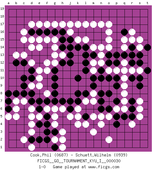 Last move : 1-0 2011 April 28 1:41:5 [Event "FICGS__GO__TOURNAMENT_KYU_I__000030"] [Site "FICGS"] [Date "2010.07.19"] [Round "1"] [Black "Cook,Phil"] [White "Schuett,Wilhelm"] [Result "1-0"] [Rating 1 "0687"] [Rating 2 "0939"] 1.q16 d17 2.p4 d3 3.g3 k4 4.e4 d4 5.f16 d15 6.d13 e14 7.e12 o17 8.p13 q10 9.o10 q8 10.o8 q6 11.o6 r4 12.m4 k6 13.k10 h17 14.h16 k17 15.k16 d6 16.e6 e5 17.f5 d5 18.d8 f6 19.e7 g5 20.f4 h6 21.j7 g4 22.f3 h3 23.f7 g6 24.g7 g2 25.j6 j5 26.h7 g14 27.h14 g12 28.h12 f11 29.d11 o15 30.o13 q15 31.m15 n14 32.f13 g13 33.f14 g15 34.g16 f15 35.e16 e15 36.d16 j16 37.j15 j17 38.l16 c15 39.m13 c16 40.h15 r15 41.n16 o16 42.g10 e10 43.c10 l7 44.l5 k5 45.g11 f12 46.e13 m8 47.m10 q12 48.p12 n13 49.n10 n12 50.l12 p11 51.p10 o11 52.n11 m17 53.m16 l17 54.k8 l4 55.m9 o2 56.n8 m3 57.o12 q11 58.n15 o14 59.l8 m7 60.k7 n4 61.q13 o5 62.n7 m5 63.p5 p6 64.n6 n5 65.d7 c7 66.p9 q9 67.c8 b7 68.b8 m14 69.l14 h13 70.j12 e17 71.j13 c13 72.c12 b13 73.b12 f17 74.p7 q7 75.r14 r16 76.r12 r11 77.s12 s11 78.a7 b6 79.a6 a5 80.a8 b5 81.t11 s14 82.s13 s15 83.s10 n17 84.r10 g17 85.s9 k15 86.j14 l15 87.k14 m12 88.l13 m11 89.l11 d9 90.c9 e11 91.d10 e9 92.g9 f8 93.g8 d14 94.t14 d12 95.f2 h2 96.d2 c2 97.e2 d1 98.g1 h1 99.r7 s7 100.r6 s6 101.r5 s5 102.q5 q14 103.r13 1-0 Here are the names of the openings (joseki) played in the four corners : Corner d4 : d3 g3 Komoku (Somok, Xiao~mu`) 3-4 Point. The komoku (3-4) point is the traditional corner enclosure move.. Corner d16 : d17 f16 Komoku (Somok, Xiao~mu`) 3-4 Point. The komoku (3-4) point is the traditional corner enclosure move.. Corner q16 : q16 o17 Hoshi (Hwajeom, Seongjeom, Xingwei`) 4-4 Point. The star or hoshi (4-4) point, emphasizing influence at the potential expense of territory. Ikken Kakari (Hankan Keolch'im, Yi Gua`jiao~, 1-Space Low Approach). White 2 is the standard approach move to the 4-4. Corner q4 : p4 q8 Takamoku (Gomok, Gaomu`) 5-4 Point. The takamoku (high) point (5-4). With its emphasis on influence, the 5-4 point complements the 4-4 (hoshi) point in creating an influence-oriented fuseki. Player Black won this Go (weiqi, baduk) game. Follow this game move after move (download)Strike at the waist of the knight's move. (Anonymous) Go and wake up your luck. (Persian saying)
