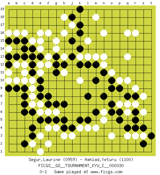 Last move : 0-1 2011 March 21 22:26:24 [Event "FICGS__GO__TOURNAMENT_KYU_I__000030"] [Site "FICGS"] [Date "2010.07.19"] [Round "1"] [Black "Segur,Laurine"] [White "Aahlad,Yeturu"] [Result "0-1"] [Rating 1 "0959"] [Rating 2 "1100"] 1.d4 q16 2.q4 c16 3.c9 o3 4.q8 q6 5.p6 r3 6.r4 q3 7.p5 q10 8.n8 e16 9.k16 q13 10.h4 k10 11.n11 n16 12.c13 h16 13.k14 h13 14.k12 k4 15.l8 g4 16.h5 h3 17.j4 j3 18.g5 f4 19.e5 n5 20.m6 e11 21.e13 c11 22.g11 f12 23.a12 b10 24.b9 a10 25.d11 d10 26.d12 c10 27.b15 b16 28.d14 f13 29.c15 b12 30.b13 c12 31.f14 e12 32.d13 g15 33.e10 d9 34.c7 g14 35.f15 e15 36.e9 d8 37.e8 d7 38.c6 e7 39.f7 f6 40.f8 e6 41.f5 g6 42.h7 a14 43.a15 b14 44.d6 n13 45.m12 o11 46.g7 d15 47.c8 a16 48.c14 e14 49.a13 a14 50.j18 j17 51.k17 h18 52.k19 m18 53.o10 p10 54.o9 r16 55.e2 m4 56.k5 l4 57.l5 h11 58.g12 r9 59.g13 f16 60.h12 s6 61.s4 f2 62.s2 e3 63.c2 s3 64.t3 d2 65.d3 e1 66.r8 s8 67.r6 n12 68.m10 r7 69.r5 k13 70.j13 q7 71.p9 p7 72.o6 n6 73.o7 l13 74.l12 m13 75.j15 l15 76.a9 a11 0-1 Here are the names of the openings (joseki) played in the four corners : Corner q4 : q4 o3 Hoshi (Hwajeom, Seongjeom, Xingwei`) 4-4 Point. The star or hoshi (4-4) point, emphasizing influence at the potential expense of territory. Ikken Kakari (Hankan Keolch'im, Yi Gua`jiao~, 1-Space Low Approach). White 2 is the standard approach move to the 4-4. Player White won this Go (weiqi, baduk) game. Follow this game move after move (download)When your opponent has two weak groups, attack them both at once. (Anonymous) You have to believe in yourself. (Sun Tzu)