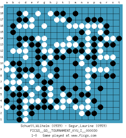 Last move : 1-0 2011 May 11 12:42:58 [Event "FICGS__GO__TOURNAMENT_KYU_I__000030"] [Site "FICGS"] [Date "2010.07.19"] [Round "1"] [Black "Schuett,Wilhelm"] [White "Segur,Laurine"] [Result "1-0"] [Rating 1 "0939"] [Rating 2 "0959"] 1.r16 d4 2.q3 d16 3.f3 j17 4.c3 d3 5.c4 d6 6.c6 d8 7.d5 e5 8.c5 f4 9.g3 h4 10.e2 d2 11.e3 e4 12.h3 k3 13.j4 j3 14.g4 h5 15.g5 h6 16.e6 f6 17.d7 e7 18.g6 d6 19.g7 c7 20.c2 h8 21.h7 k5 22.q6 q12 23.o17 q9 24.c14 c12 25.c17 c16 26.d17 e16 27.b16 g16 28.b15 m16 29.e14 g14 30.f13 g13 31.f12 d13 32.d14 f14 33.e13 d11 34.g11 g12 35.f10 e17 36.f8 d1 37.c1 n3 38.j11 h11 39.h10 h12 40.j8 g9 41.j9 g10 42.f11 p16 43.p17 q16 44.q17 q15 45.r15 q13 46.r8 r9 47.s8 o16 48.s10 r11 49.j12 j13 50.l12 l13 51.n12 m13 52.m12 o9 53.m6 o6 54.m4 m3 55.l5 k4 56.m8 n10 57.m10 o12 58.o2 o3 59.p2 n2 60.c13 d12 61.b10 b12 62.d9 b8 63.c9 b6 64.b5 a5 65.a4 a3 66.a6 b7 67.b3 e8 68.e9 b9 69.c10 a7 70.s13 s11 71.m18 d18 72.c18 f18 73.k18 k17 74.j18 h18 75.l17 l16 76.n13 a9 77.c8 a10 78.n15 n16 79.m14 l14 80.o5 o7 81.p4 o4 82.n5 l4 83.k6 k12 84.k11 k13 85.o11 n11 86.p8 o8 87.p12 o13 88.p13 o14 89.p14 o15 90.p10 p9 91.q14 q11 92.p11 r14 93.r13 s14 94.t14 1-0 Here are the names of the openings (joseki) played in the four corners : Corner d4 : d4 f3 Hoshi (Hwajeom, Seongjeom, Xingwei`) 4-4 Point. The star or hoshi (4-4) point, emphasizing influence at the potential expense of territory. Ikken Kakari (Hankan Keolch'im, Yi Gua`jiao~, 1-Space Low Approach). Black 2 is the standard approach move to the 4-4. Corner q16 : r16 q12 Komoku (Somok, Xiao~mu`) 3-4 Point. The komoku (3-4) point is the traditional corner enclosure move.. Player Black won this Go (weiqi, baduk) game. Follow this game move after move (download)If a formation is symmetrical, play at the center. (Anonymous) Unless in communicating with it one says exactly what one means, trouble is bound to result. (Alan Turing, about computers)