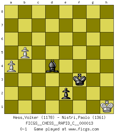 Last move : 0-1 2006 December 21 14:28:24 [Event "FICGS__CHESS__RAPID_C__000013"] [Site "FICGS"] [Date "2006.11.14"] [Round "1"] [White "Hess,Volker"] [Black "Nistri,Paolo"] [Result "0-1"] [WhiteElo "1178"] [BlackElo "1361"] 1.c4 e5 2.g3 Nf6 3.Bg2 c6 4.e4 d5 5.cxd5 cxd5 6.exd5 Nxd5 7.Nf3 Nc6 8.O-O Bg4 9.Qb3 Ndb4 10.Nc3 Be7 11.Re1 Nd3 12.Re3 Bc5 13.Rxd3 Qxd3 14.Ng5 Qd7 15.d3 Nd4 16.Qxb7 Qxb7 17.Bxb7 Rb8 18.Bd5 O-O 19.Nce4 Ne2+ 20.Kf1 Nxc1 21.Rxc1 Bd4 22.b3 h6 23.Nxf7 Kh7 24.Ned6 Bh5 25.Be4+ Bg6 26.Rc7 Bxe4 27.dxe4 Rb6 28.Nf5 Rf6 29.N7xh6 Rxh6 30.Nxh6 Kxh6 31.Rc2 g5 32.h3 Kh5 33.Kg2 Kg6 34.f3 Rf6 35.Rc4 a5 36.h4 gxh4 37.gxh4 Kh5 38.Ra4 Bc3 39.Rc4 Bd4 40.Kg3 Rg6+ 41.Kh3 Rf6 42.Kg3 Rg6+ 43.Kh3 Bf2 44.Ra4 Rg3+ 45.Kh2 Kxh4 46.Rxa5 Bg1+ 47.Kh1 Bd4 48.Ra8 Rxf3 49.Rh8+ Kg3 50.Rg8+ Kf4 51.Rf8+ Kxe4 52.Rxf3 Kxf3 53.a4 e4 54.b4 e3 55.b5 e2 0-1 English Opening Kingside Castling by player White (move 8) Kingside Castling by player Black (move 18) 10 pieces endgame at move 46 : White KRPPPP , Black KRBP WHITE : King + 1 Rook 4 Pawns BLACK : King + 1 Rook 1 Bishop 1 Pawn 9 pieces endgame at move 48 : White KRPPP , Black KRBP WHITE : King + 1 Rook 3 Pawns BLACK : King + 1 Rook 1 Bishop 1 Pawn 8 pieces endgame at move 51 : White KRPP , Black KRBP WHITE : King + 1 Rook 2 Pawns BLACK : King + 1 Rook 1 Bishop 1 Pawn 7 pieces endgame at move 52 : White KRPP , Black KBP WHITE : King + 1 Rook 2 Pawns BLACK : King + 1 Bishop 1 Pawn 6 pieces endgame at move 52 : White KPP , Black KBP WHITE : King + 2 Pawns BLACK : King + 1 Bishop 1 Pawn Player Black won this chess game. Follow this game move after move (download)I played Chess with him and would have beaten him sometimes only he always took back his last move, and ran the game out differently. (Mark Twain) Das Schachspiel übertrifft alle anderen Spiele so weit wie der Chimborasso einen Misthaufen. (Arthur Schopenhauer) La táctica fluye a partir de una posición superior. (Bobby Fischer) Les Echecs ont trois composantes : le temps, l'espace et le matériel en dernier. (Mikhail Tal) Convictions are more dangerous enemies of truth than lies. (Friedrich Nietzsche)