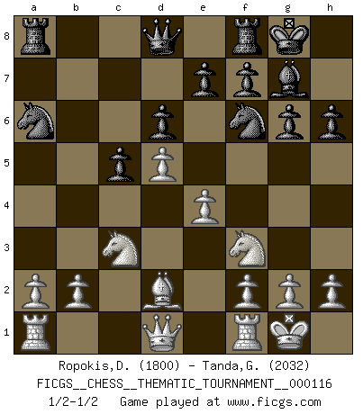 Last move : 1/2-1/2 2010 August 25 14:23:6 [Event "FICGS__CHESS__THEMATIC_TOURNAMENT__000116"] [Site "FICGS"] [Date "2010.07.21"] [Round "1"] [White "Ropokis,Dimitrios"] [Black "Tanda,Giovanni"] [Result "1/2-1/2"] [WhiteElo "1800"] [BlackElo "2032"] 1.d4 Nf6 2.c4 g6 3.Nc3 Bg7 4.e4 d6 5.Nf3 O-O 6.Bg5 c5 7.d5 b5 8.cxb5 a6 9.bxa6 h6 10.Bd2 Bxa6 11.Bxa6 Nxa6 12.O-O 1/2-1/2 King's Indian : Zinnowitz variation Kingside Castling by player Black (move 5) Kingside Castling by player White (move 12) This chess game ended in a draw. Follow this game move after move (download)Bobby Fischer's current state of mind is indeed a tragedy. One of the world's greatest Chess players - the pride and sorrow of American Chess. (Frank Brady) Woher wissen wir, daß der Neanderthaler Blindschach gespielt hat? -- Bei Ausgrabungen wurden keine Schachbretter und Figuren gefunden. (Anonymous) Un buen jugador siempre tiene buena suerte. (José Raúl Capablanca) Nous vivons dans un monde échiquéen : chaque jour qui passe est un défi à relever. (Philosophe Sasha) The difference between perseverance and obstinacy is that one comes from a strong will, and the other from a strong won't. (Henry Ward Beecher)