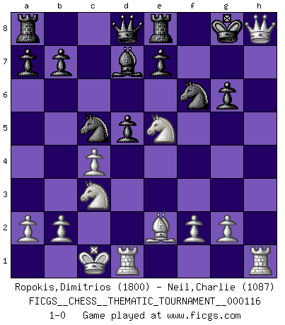 Last move : 1-0 2010 August 3 17:55:40 [Event "FICGS__CHESS__THEMATIC_TOURNAMENT__000116"] [Site "FICGS"] [Date "2010.07.21"] [Round "1"] [White "Ropokis,Dimitrios"] [Black "Neil,Charlie"] [Result "1-0"] [WhiteElo "1800"] [BlackElo "1087"] 1.d4 Nf6 2.c4 g6 3.Nc3 Bg7 4.e4 d6 5.Bg5 O-O 6.Nf3 Nc6 7.d5 Nb8 8.Qd2 Nbd7 9.Be2 h6 10.Bxh6 Re8 11.Bxg7 Kxg7 12.O-O-O Nc5 13.e5 dxe5 14.Nxe5 Bd7 15.h4 c6 16.h5 cxd5 17.hxg6 fxg6 18.Qh6+ Kg8 19.Qh8+ 1-0 King's Indian : Accelerated Averbakh system Kingside Castling by player Black (move 5) Queenside Castling by player White (move 12) Player White won this chess game. Follow this game move after move (download)Chess is a foolish expedient for making idle people believe they are doing something very clever when they are only wasting their time. (George Bernard Shaw) Versuche, dich von der Sklaverei der Eröffnungsvarianten zu befreien. Stattdessen soll man gewisse Typenpositionen erlernen, die man eingehend analysiert. (Aaron Nimzowitsch) Yo jugué Ajedrez con el y a veces le pude haber ganado solo que siempre devuelve su última jugada y juega la partida de manera diferente. (Mark Twain) Les réformistes prétendent que les progrès de la théorie conduiront à la disparition des échecs, et qu'il faut, pour leur rendre vie, en remanier les règles. En réalité, qu'exprime cette affirmation? Le mépris de l'intuition, de l'imagination et de tous les autres éléments qui font des échecs un art. (Alexander Alekhine) There is a great deal of difference between an eager man who wants to read a book and a tired man who wants a book to read. (G.K. Chesterton)