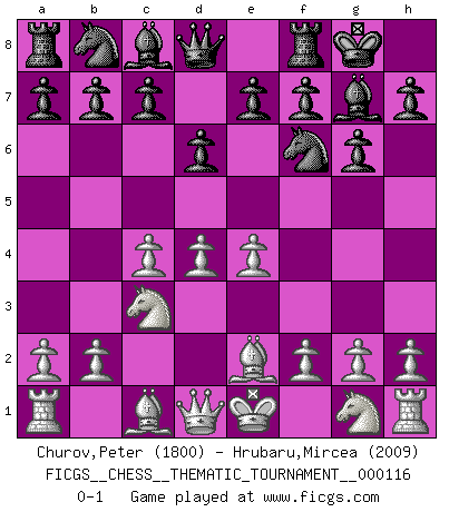 Last move : 0-1 2010 August 31 10:55:35 [Event "FICGS__CHESS__THEMATIC_TOURNAMENT__000116"] [Site "FICGS"] [Date "2010.07.21"] [Round "1"] [White "Churov,Peter"] [Black "Hrubaru,Mircea"] [Result "0-1"] [WhiteElo "1800"] [BlackElo "2009"] 1.d4 Nf6 2.c4 g6 3.Nc3 Bg7 4.e4 d6 5.Be2 O-O 0-1 This chess game has been lost on time (started : 2010.07.21 0:37:6) King's Indian : 5.Be2 Kingside Castling by player Black (move 5) Player Black won this chess game. Follow this game move after move (download)Nowadays, when you're not a grandmaster at 14, you can forget about it. (Anand Viswanathan) Nie in meinem Leben habe ich die französische Verteidigung gespielt, welche die Stumpfsinnigste von allen ist. (Wilhelm Steinitz) No solamente yo pronostico su triunfo sobre Botvinnik, sino que me adelanto y digo que probablemente Fischer es el jugador de Ajedrez mas grande que haya existido. (John Collins) Celui qui prend des risques peut perdre, celui qui n'en prend pas perd toujours. (Xavier Tartacover) A good programmer is someone who always looks both ways before crossing a one-way street. (Doug Linder)