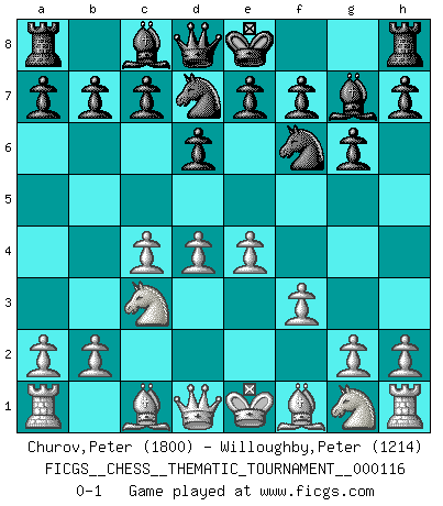 Last move : 0-1 2010 August 30 22:52:13 [Event "FICGS__CHESS__THEMATIC_TOURNAMENT__000116"] [Site "FICGS"] [Date "2010.07.21"] [Round "1"] [White "Churov,Peter"] [Black "Willoughby,Peter"] [Result "0-1"] [WhiteElo "1800"] [BlackElo "1214"] 1.d4 Nf6 2.c4 g6 3.Nc3 Bg7 4.e4 d6 5.f3 Nbd7 0-1 This chess game has been lost on time (started : 2010.07.21 0:37:6) King's Indian : Saemisch variation Player Black won this chess game. Follow this game move after move (download)Chess is a terrible game. If you have no center, your opponent has a freer position. If you do have a center, then you really have something to worry about ! (Siegbert Tarrasch) Ich würde die 30 stärksten Spieler der USA im Simultanspiel besiegen. (José Raúl Capablanca) Estaba muy claro de que el punto vulnerable del Gran Maestro Americano (Bobby Fischer) radicaba en las posiciones de doble filo, colgantes, irracionales, donde el siempre falló en encontrar un triunfo aún en una posición de clara victoria. (Efim Geller) Le temps de noter son nom sur la feuille de partie, j'étais déjà en zeitnot ! D'un modeste amateur apparié lors de la première ronde d'un open contre le grand-maître Azmaïparashvili. If only faces could talk... (Pat Summerall, Sportscaster during the Super Bowl)